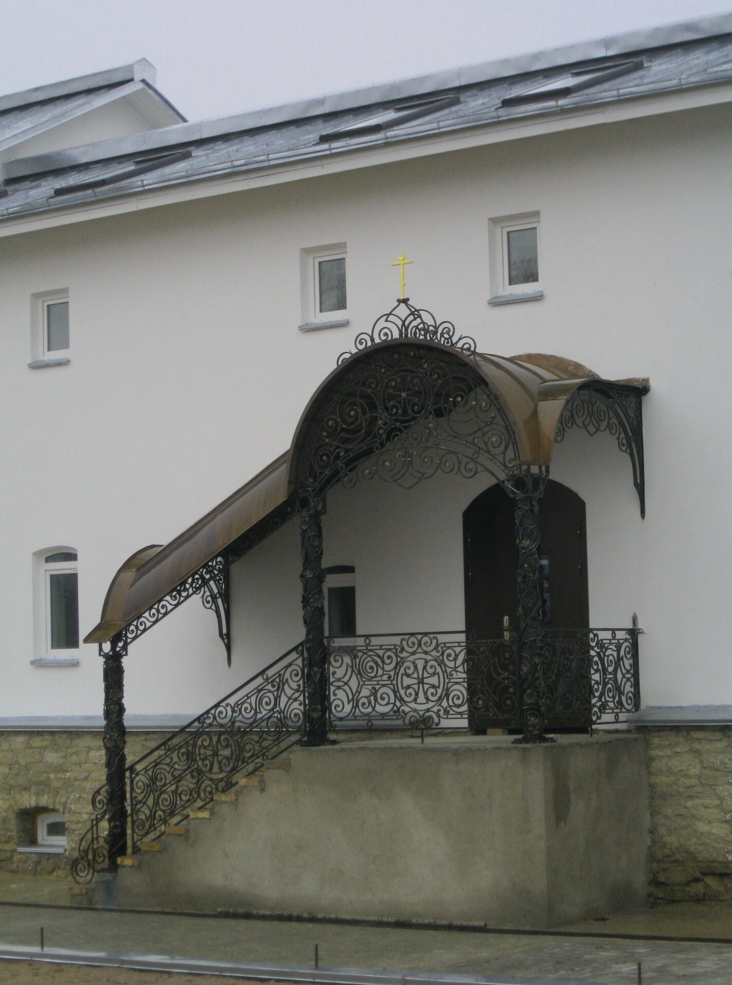 На представленной фотографии запечатлено крыльцо одного из зданий Снетогорского монастыря, что расположен в древнем городе Пскове. Координаты (57.83530000; 28.26300000) точно указывают на эту обитель, известную своей богатой историей и духовными традициями. Вход украшен изящным кованым металлическим навесом и перилами с художественными элементами, что свидетельствует о высоком уровне кузнечного мастерства русских умельцев. Над входом, на крыше навеса, установлен небольшой крест, являющийся символом христианской веры и указывающий на религиозное назначение здания.