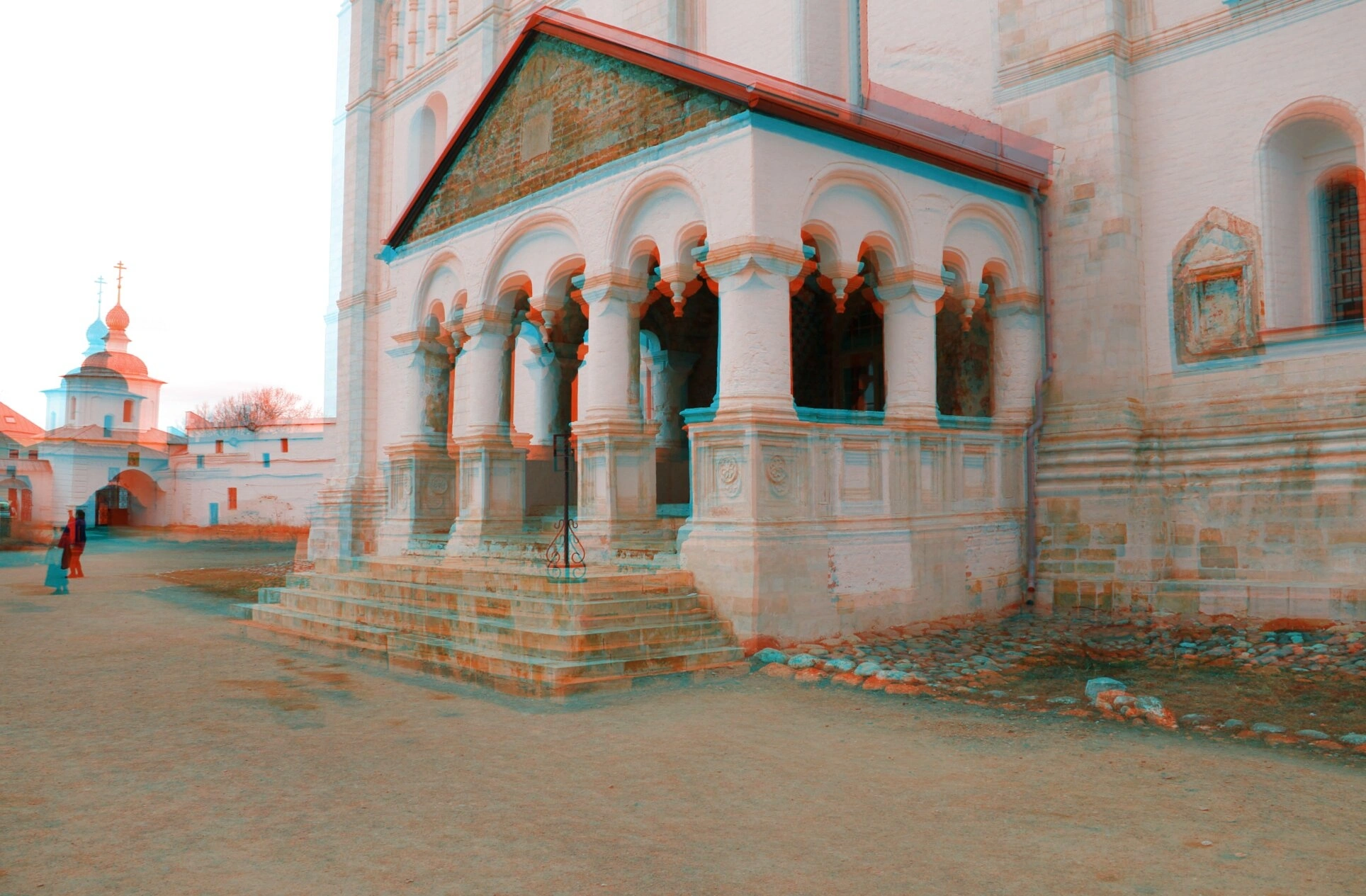 Фотография выполнена с применением анаглифного 3D-эффекта, что создает объемное восприятие святыни и позволяет оценить глубину пространства церковной паперти. Данный снимок представляет не только художественную, но и историко-культурную ценность, запечатлев уникальный памятник православной архитектуры в формате стереоскопического изображения.