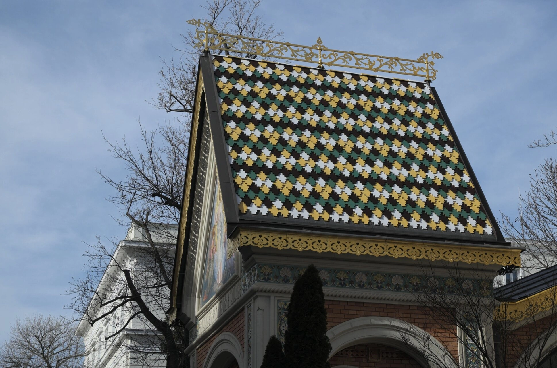 На представленной фотографии запечатлён вид на крышу и величественные золочёные купола собора Святителя Николая Чудотворца в Вене, являющегося кафедральным собором Венской и Австрийской епархии Русской Православной Церкви. Архитектурный ансамбль кровли, выполненный из тёмного материала, эффектно контрастирует с сиянием центральной луковичной главки и четырёх окружающих её главок, увенчанных традиционными православными крестами.