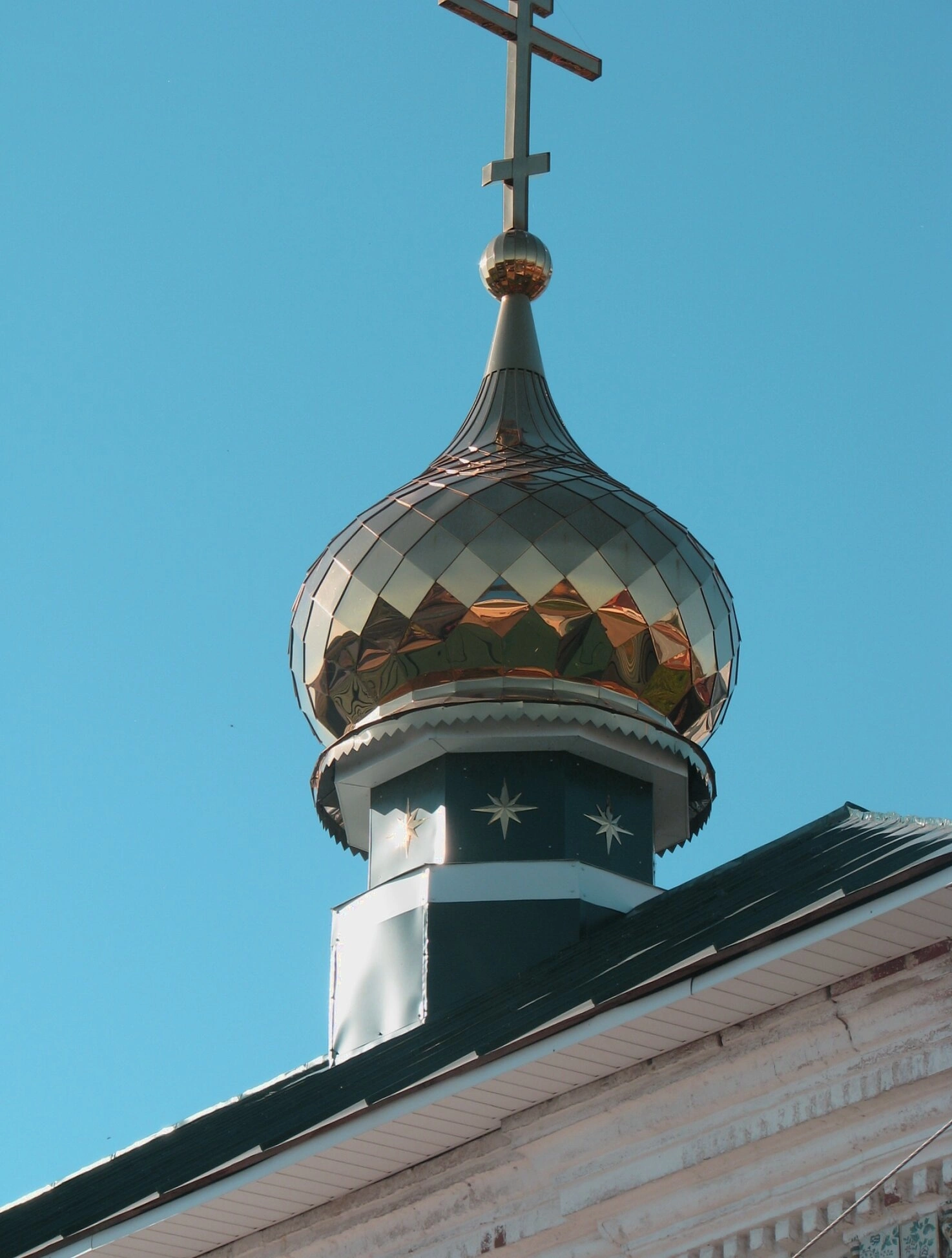 Венчает главу восьмиконечный православный крест, установленный на небольшом изящном шаре — «яблоке», что символизирует царственную власть Господа нашего Иисуса Христа над миром. Барабан купола украшен декоративным поясом с рельефным орнаментом, а также рядами звёзд, которые в христианской традиции олицетворяют свет Евангелия, освещающий весь мир. В нижней части снимка видны элементы кровли и белоснежные стены храма, контрастирующие с лазурью неба и благородным золотом главы.