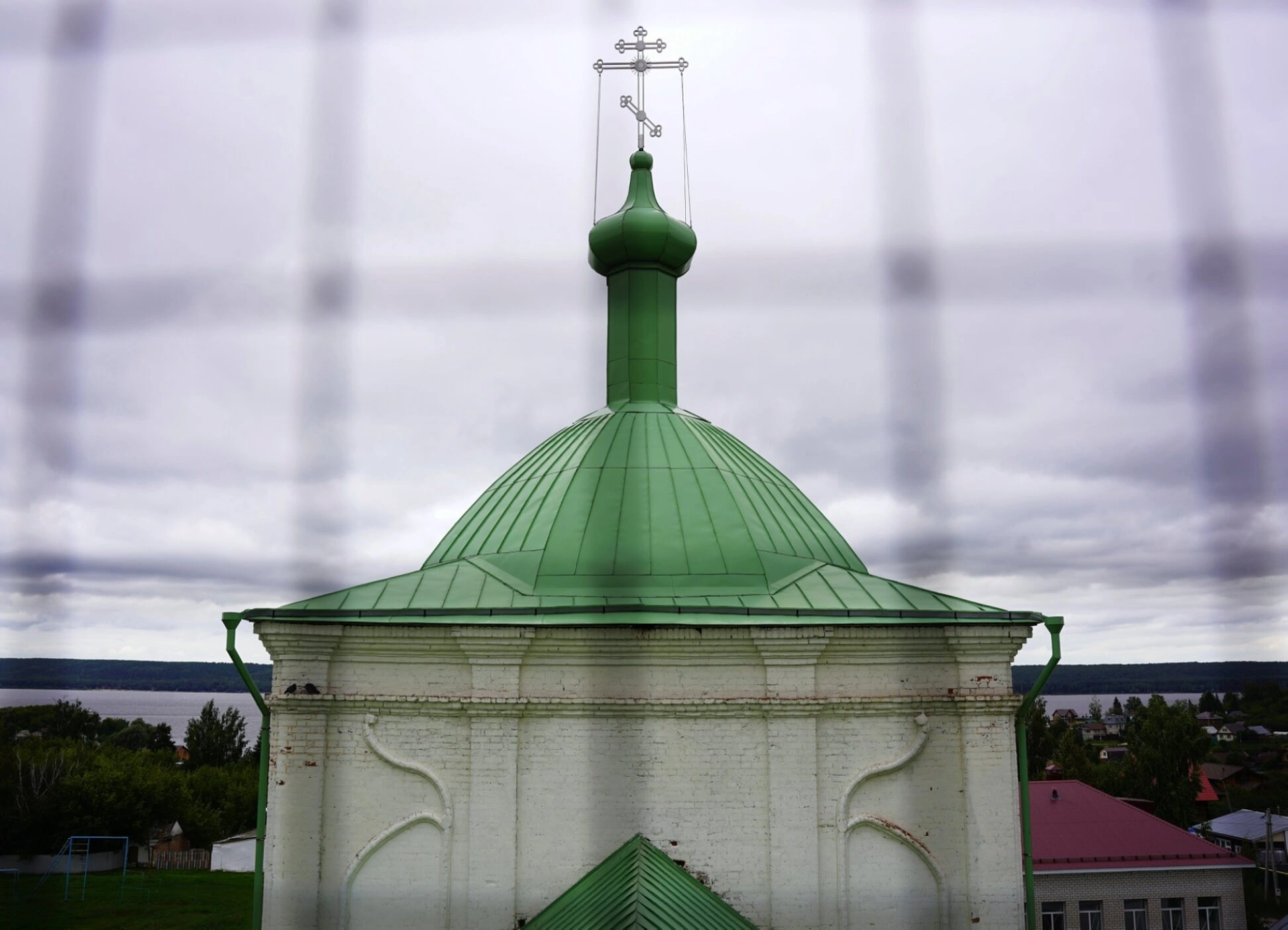 Фон фотографии составляют живописные виды окрестностей поселка Шеланга: водная гладь реки Волги, густые кроны деревьев и пасмурное небо, придающее снимку особое настроение. Легкая размытость переднего плана, создаваемая сетчатым ограждением, добавляет изображению эффект присутствия и легкой таинственности. Этот храм, возрожденный в постсоветский период, является духовным центром для православных верующих и важным архитектурным памятником региона.