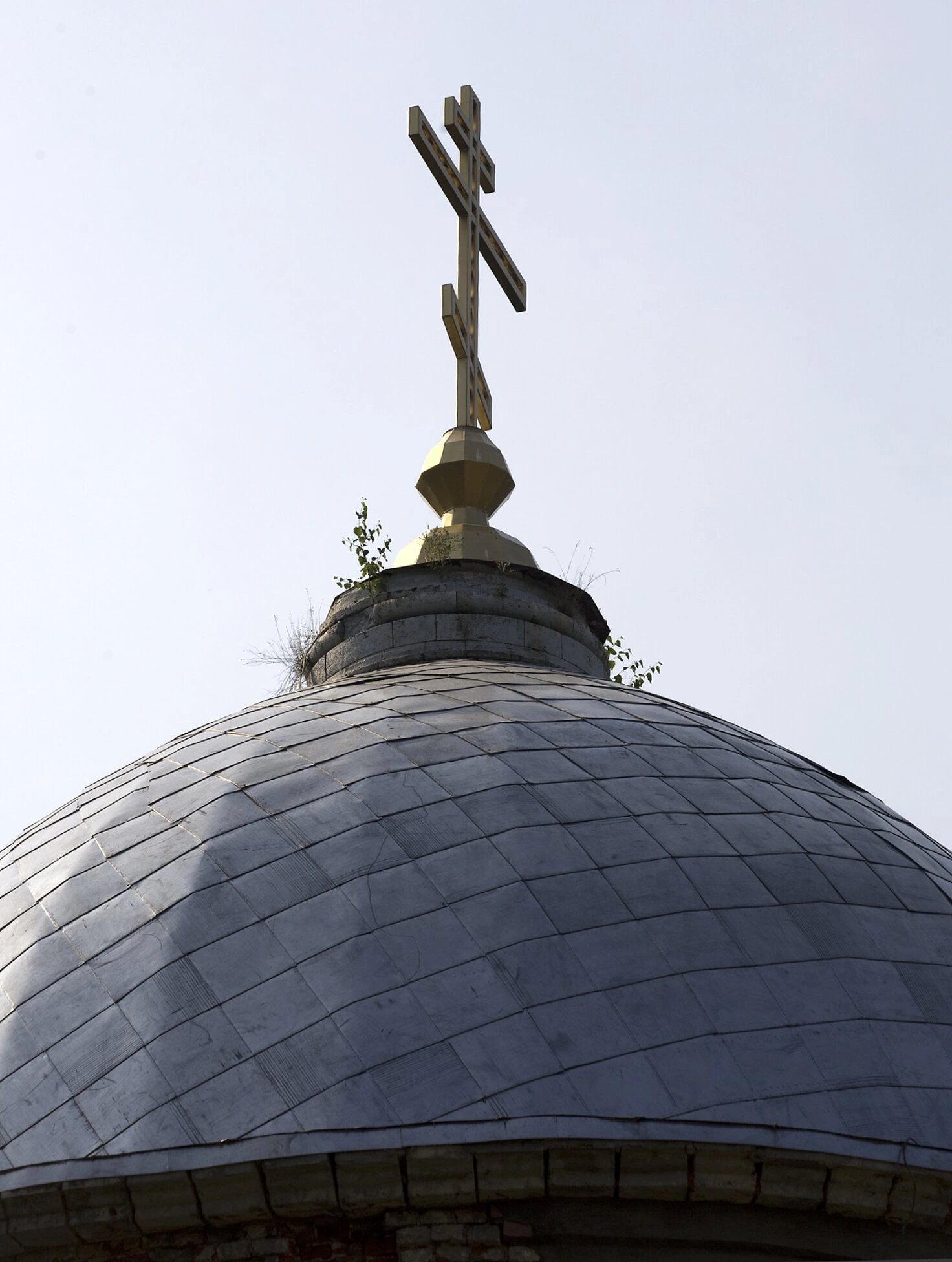 Основание купола украшает изящный декоративный пояс, подчёркивающий традиции русского церковного зодчества. Примечательной деталью, видимой на снимке, является прорастающая у основания креста растительность, что символически напоминает о вечной жизни и силе веры, прорастающей сквозь любые преграды.