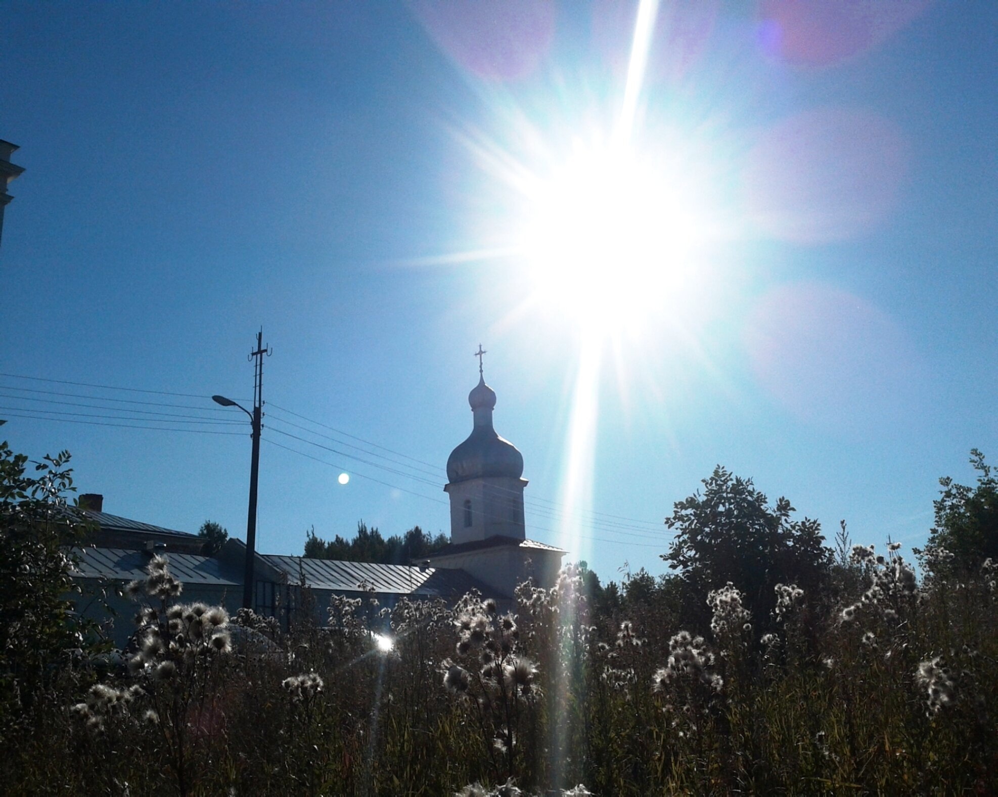 На переднем плане, создавая естественное обрамление, видны освещённые солнцем полевые растения, символизирующие нетронутую благодатную природу, окружающую святую обитель. Главный фокус изображения устремлён ввысь, где на фоне безмятежного голубого неба сияет золотой купол, увенчанный православным крестом, и часть белоснежной колокольни.