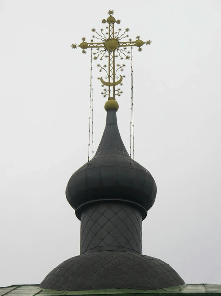 Купол, выполненный в традиционной для русского храмового зодчества луковичной форме, покрыт материалом темного оттенка. На его поверхности просматривается четкий ромбовидный узор, создающий благородную игру света и тени. Подобное покрытие не только выполняет практическую функцию, но и придает куполу особую выразительность.