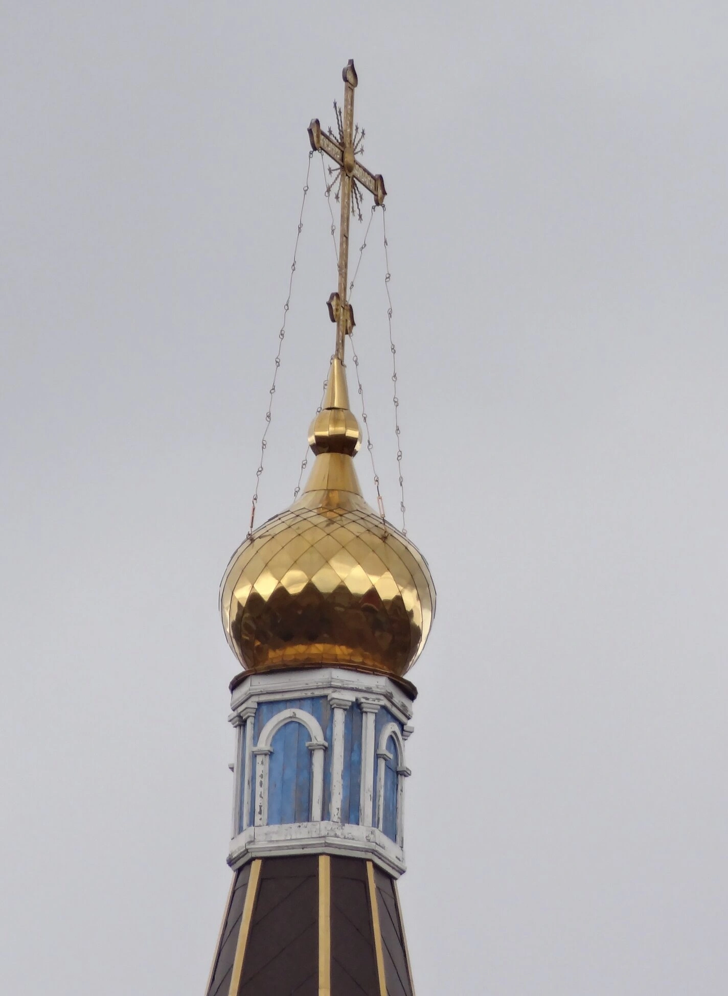На представленной фотографии запечатлён величественный купол и сияющий крест Церкви Покрова Пресвятой Богородицы, что находится в городе Каменске-Уральском Свердоловской области. Золотистая главка луковичной формы, традиционная для русского православного зодчества, отражает небесный свет, символизируя горний мир и благодать. На её вершине установлен восьмиконечный православный крест, также выполненный в золотом цвете, — символ искупительной жертвы Христа Спасителя. От креста к основанию купола спускаются изящные металлические цепи, обеспечивающие его устойчивость.