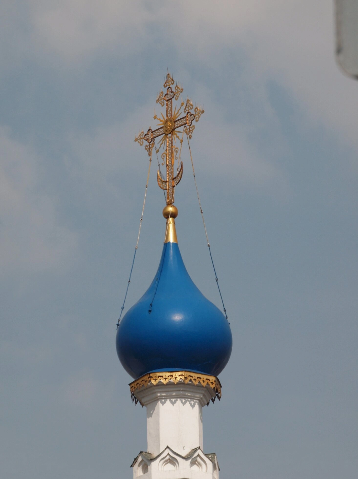 Главный купол храма, изображённый на снимке, имеет характерную луковичную форму и выполнен в насыщенном синем цвете, символизирующем небесную чистоту и Богородицу. Основание купола украшено позолотой, что создаёт благолепный контраст. Купол венчает изящный позолоченный крест сложной формы с декоративными элементами, характерными для русской православной традиции. В основании креста присутствует символический полумесяц, что исторически означает якорь спасения и победу христианства.