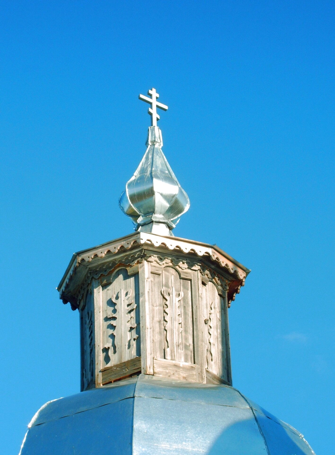 Глядя на снимок, обращаешь внимание на традиционное для русского деревянного зодчества устройство главы, увенчанной православным восьмиконечным крестом. Крест, устремлённый в небеса, символизирует надежду на спасение и вечную жизнь, дарованную Господом нашим Иисусом Христом. Купол, выполняющий роль духовного щита, покрыт деревянным лемехом, что придаёт ему особую фактуру и узнаваемый облик.