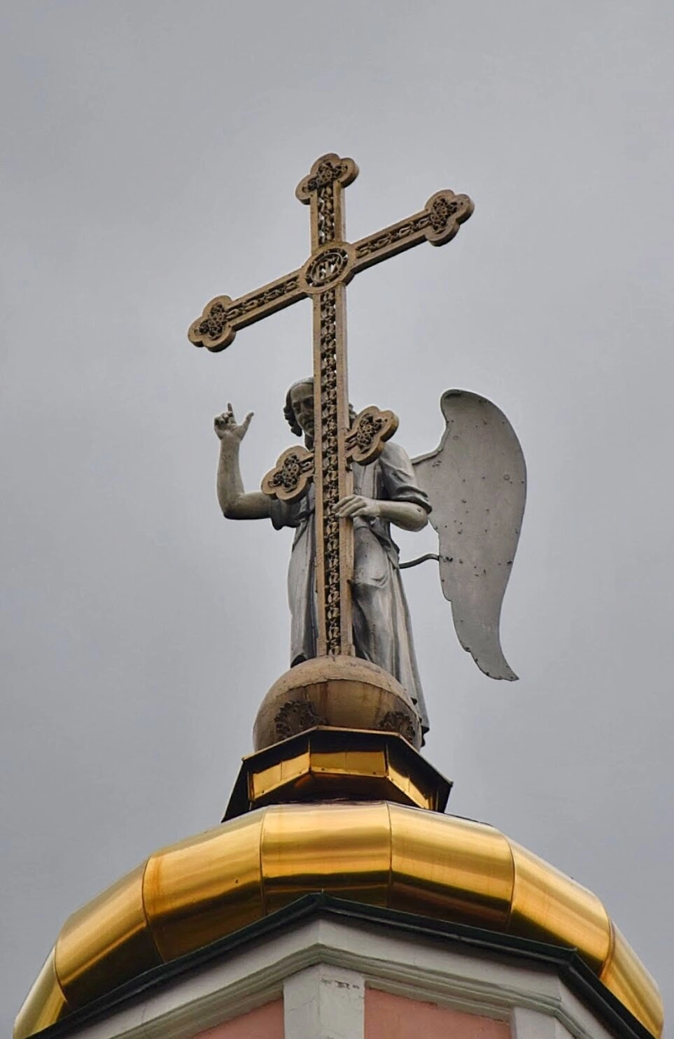 На представленной фотографии запечатлена величественная часть золотого купола и навершие с православным крестом Успенской церкви в селе Успенское. На вершине купола, сияя на фоне небес, установлен восьмиконечный православный крест, символизирующий искупительную жертву Господа нашего Иисуса Христа. У основания креста находится скульптурное изображение ангела Божия с распростёртыми крыльями, благоговейно поддерживающего святыню. Фигура небесного посланника исполнена глубокого смысла: его десница воздета вверх, указую путь ко спасению и вечной жизни во Христе.
