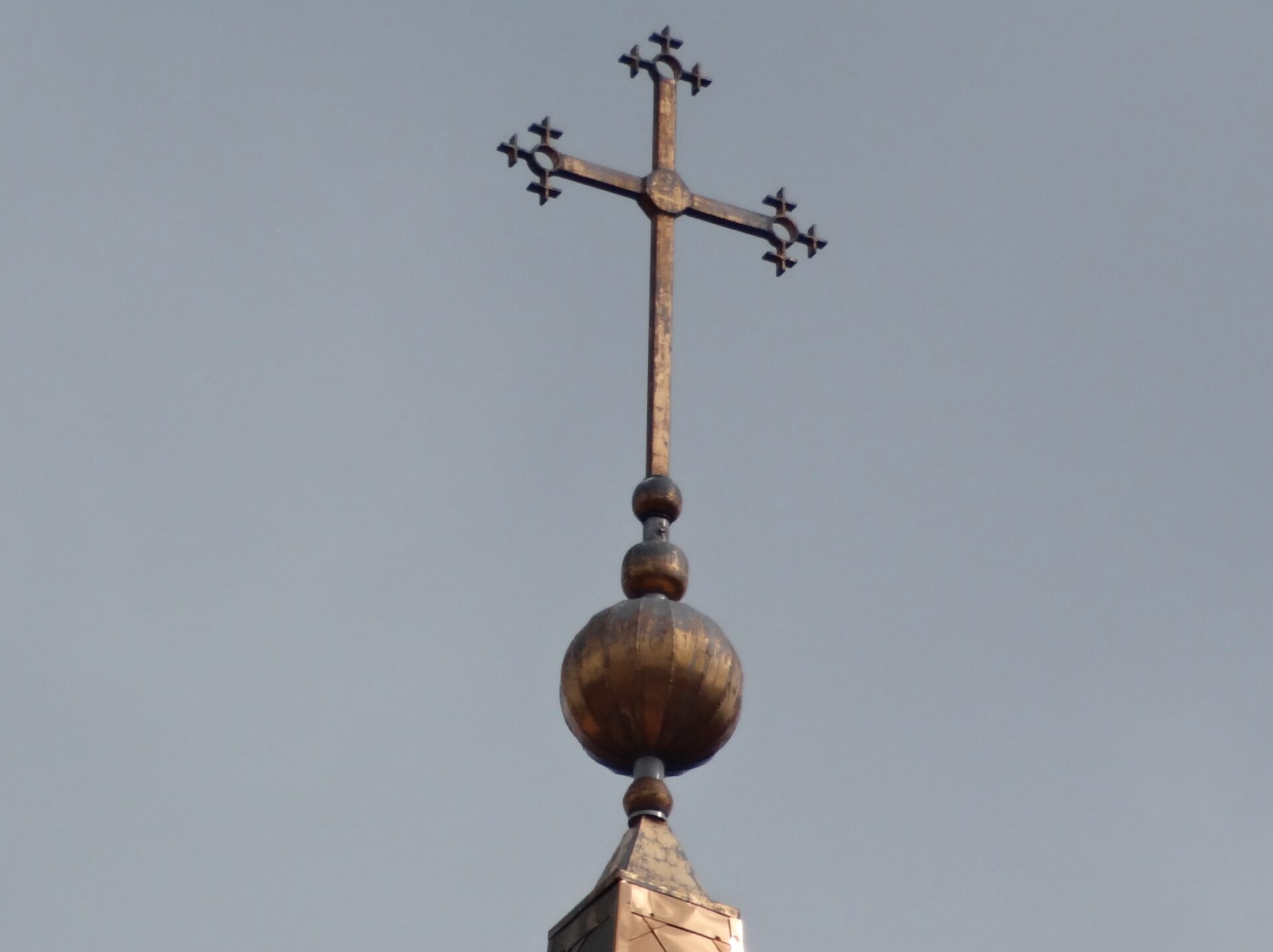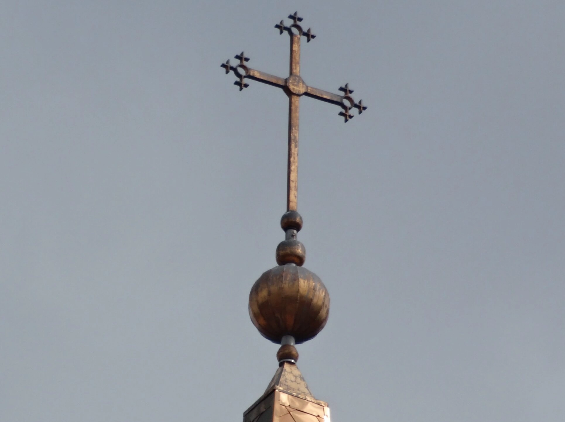 Основание креста прочно утверждено на стройном шпиле, который возносится над малыми сферическими главками, выполняющими роль духовных стражей у подножия главной святыни. Ниже раскрывается сияющая золотом луковичная глава основного купола храма, форма которой напоминает пламя свечи, устремлённое к небесам. Покрытие купола выполнено с применением современной техники золочения, благодаря чему он ярко сияет даже в пасмурный день, запечатлённый на снимке.