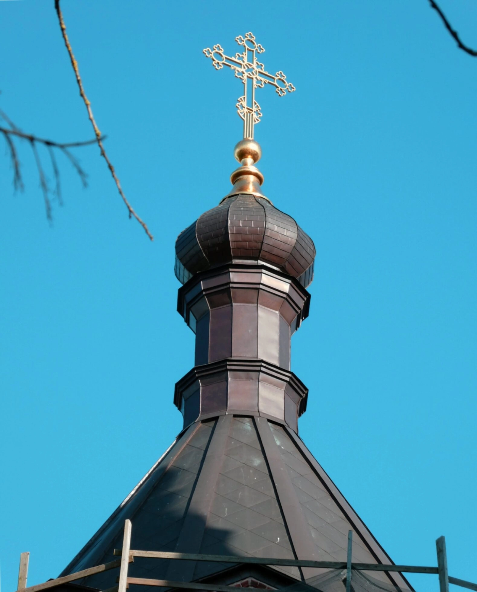На представленной фотографии запечатлён величественный купол, увенчанный сияющим крестом, Воскресенского собора в городе Луга. Этот кафедральный собор является одной из главных православных святынь Ленинградской области и архитектурной доминантой исторического центра города.