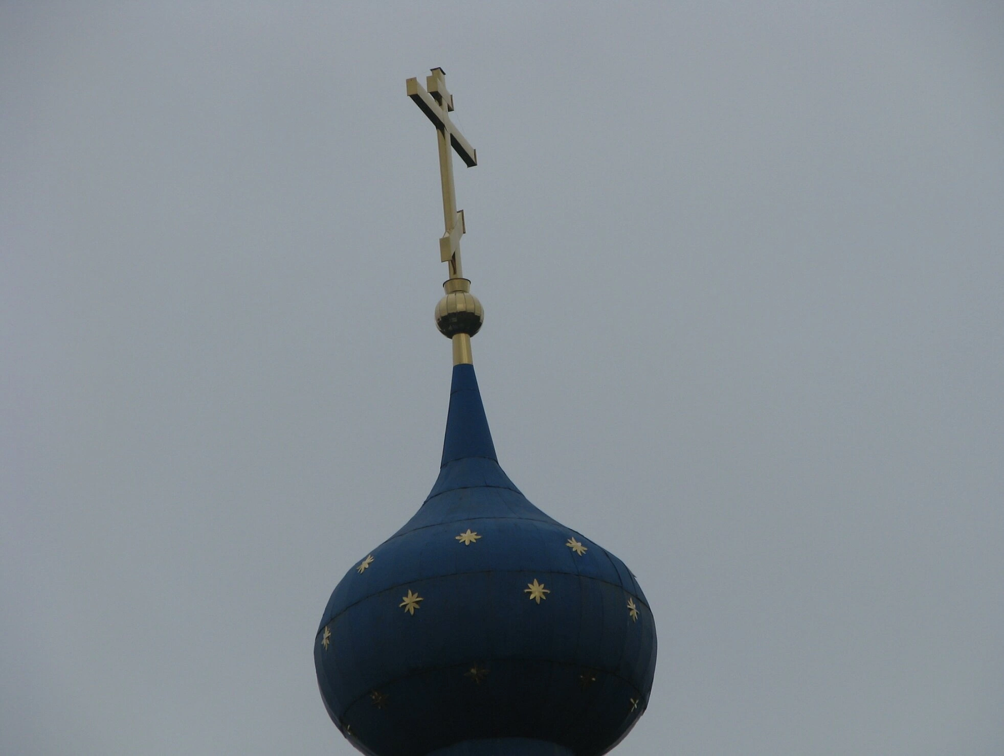 Над куполом возвышается золоченое «яблоко» — сферическое основание для креста, которое в православной символике означает плод духовного спасения. На этом основании установлен массивный восьмиконечный крест, выполненный из металла с золочеными элементами. Каждый из концов креста завершается декоративными трилистниками, что характерно для традиционного русского православия.