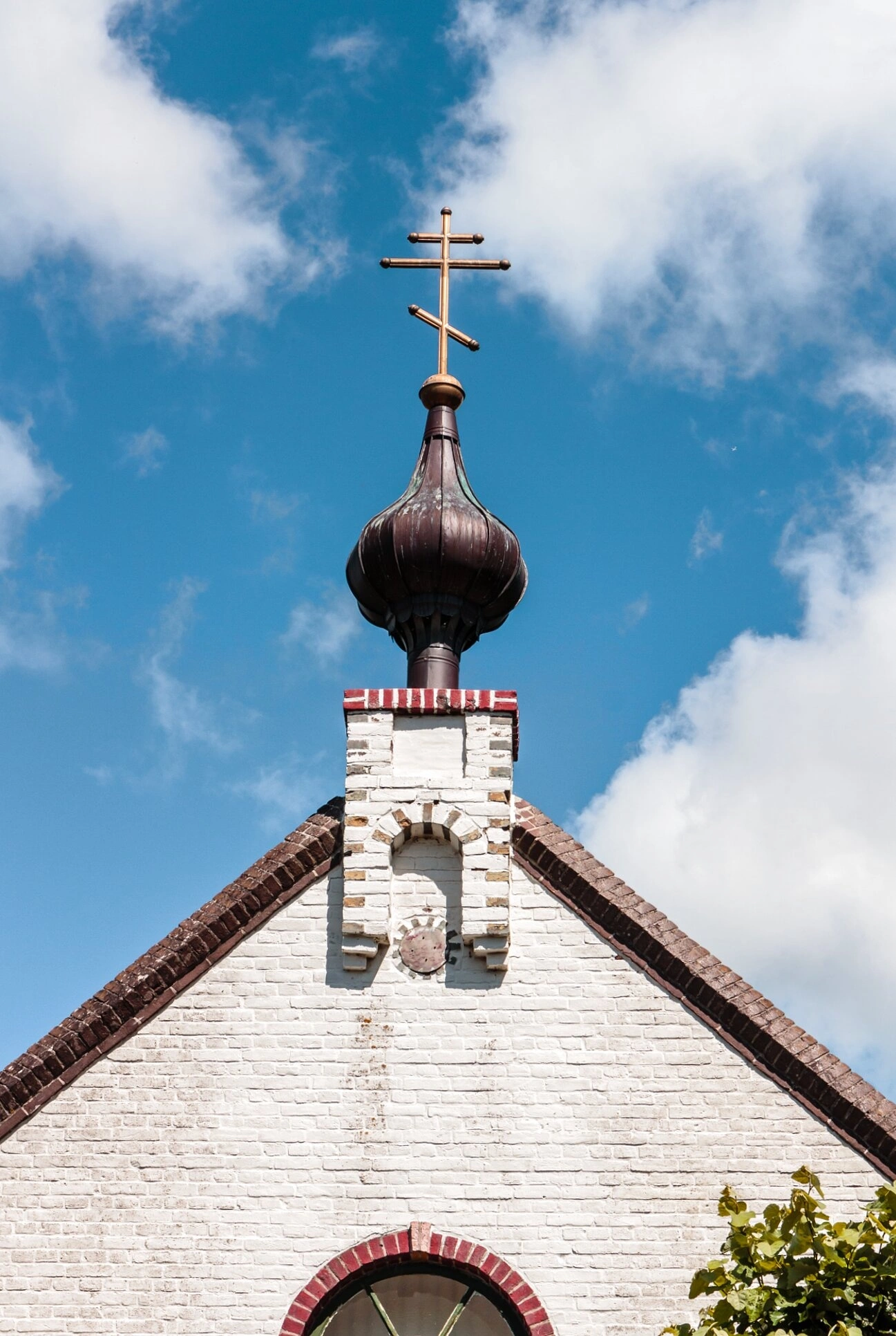 На представленной фотографии запечатлён величественный купол, увенчанный златоглавым православным крестом, принадлежащий Русскому православному монастырю во имя святых царственных страстотерпцев, что расположен в нидерландской деревне Хемелум (Hemelum) в провинции Фрисландия. Святой крест, венчающий купол, выполнен в лучших традициях русского церковного искусства: его форма с нижней косой перекладиной является канонической для православного мира и глубоко символична.