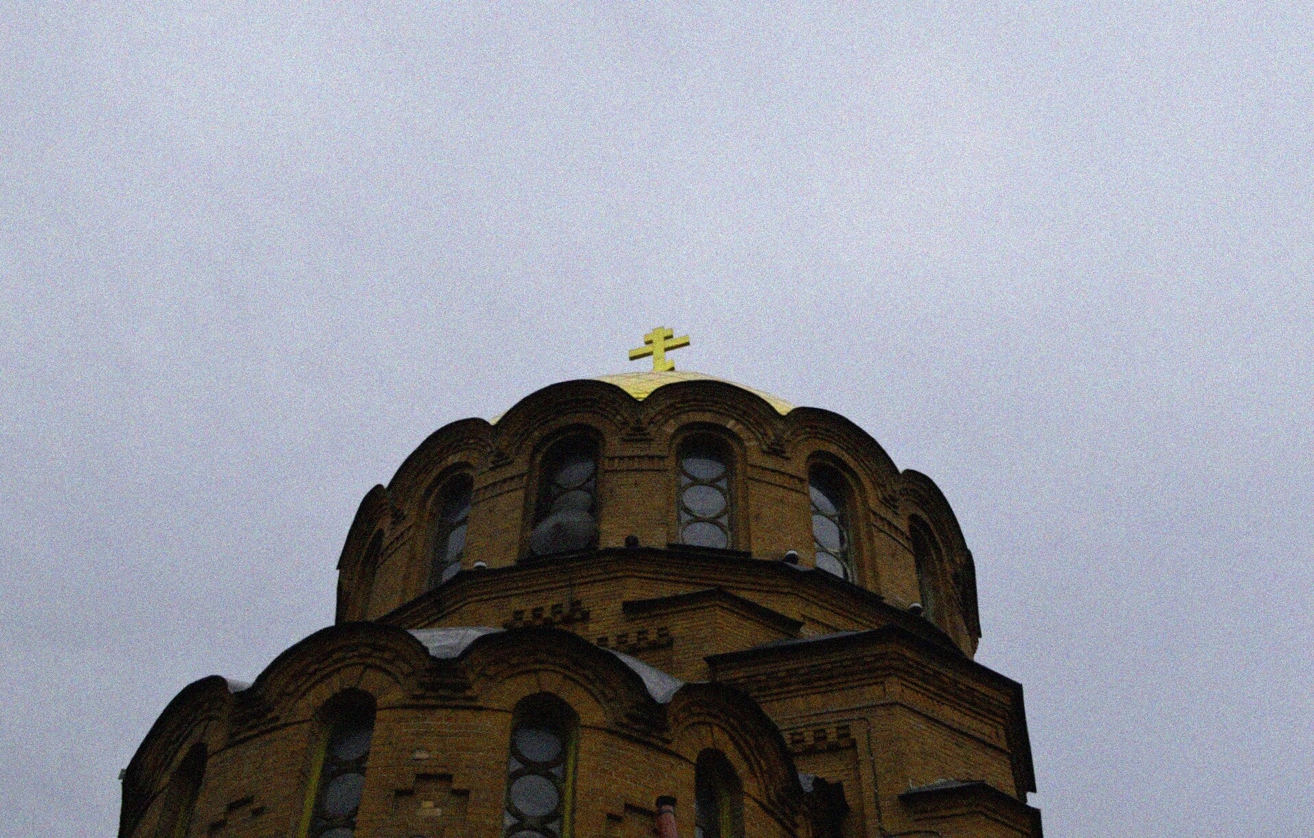 На представленной фотографии запечатлён величественный купол и верхняя часть одного из старейших православных храмов Новосибирска — Собора во имя Святого Благоверного Князя Александра Невского. Центральный золочёный купол, сияющий даже в пасмурный день, гордо возносится к небу и увенчан традиционным православным восьмиконечным крестом, символизирующим искупительную жертву Христа.