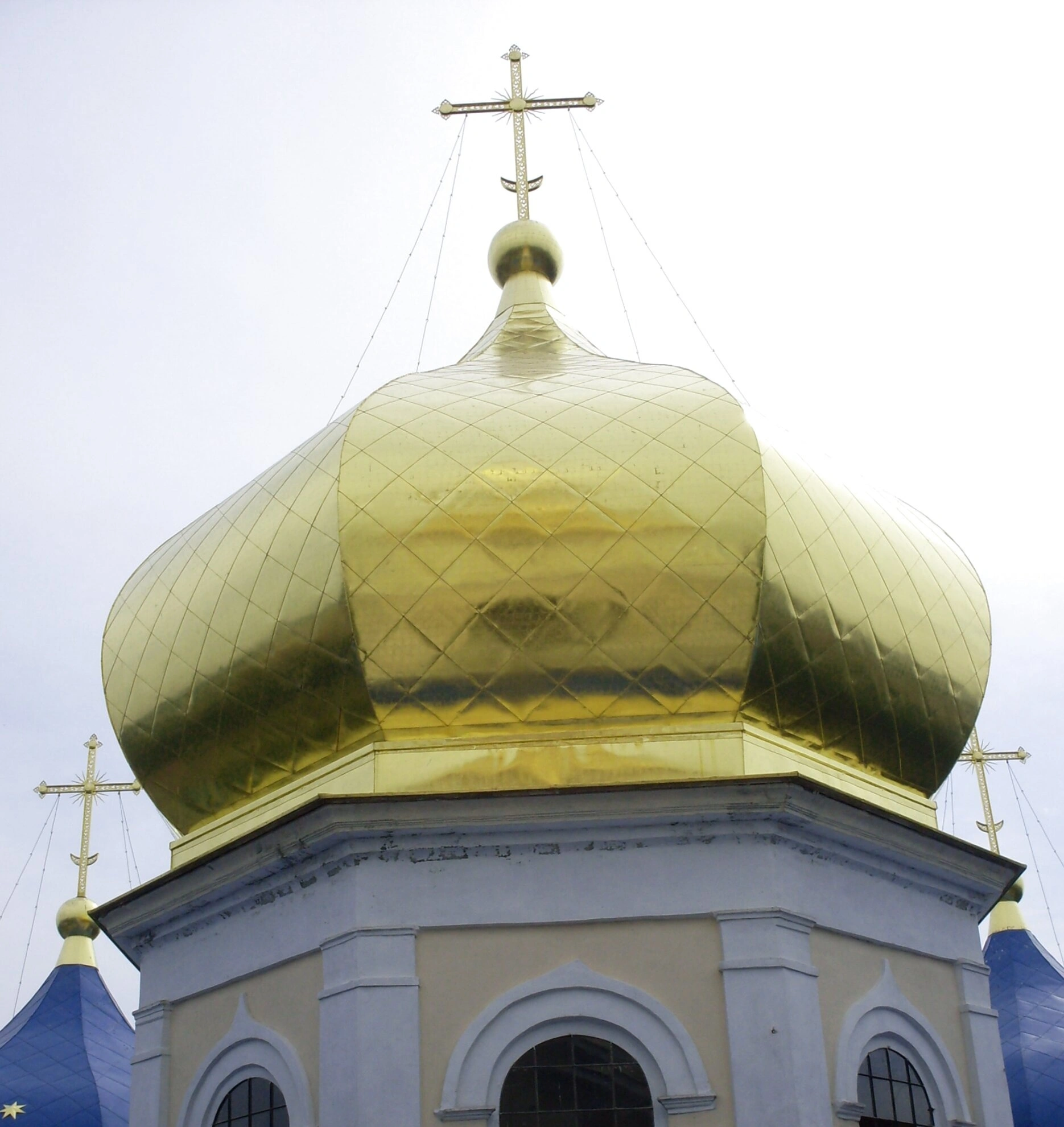 На представленной фотографии запечатлён величественный золочёный купол Спасо-Преображенского собора, являющегося главным православным храмом древнего города Болхова Орловской области. Центральный купол, выполненный в традиционной луковичной форме, обильно украшен изящным ромбовидным узором, который создаёт игру света и тени под лучами солнца. На вершине купола установлен восьмиконечный православный крест, символ искупительной жертвы Христа, сияющий в небесной вышине.