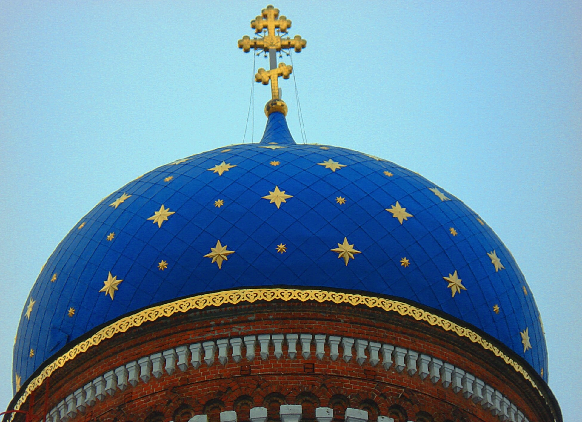 На представленной фотографии запечатлён величественный купол одного из значимых православных храмов Ростова-на-Дону — Сретенского собора. Небесно-синяя глава обильно усыпана золотыми звёздами, что создаёт глубокий символический образ, напоминающий о звёздном небесном своде и Богородице, Царице Небесной. Венчает купол золочёный восьмиконечный православный крест, сияющий в лучах солнца как символ победы жизни над смертью и искупительной жертвы Христа.