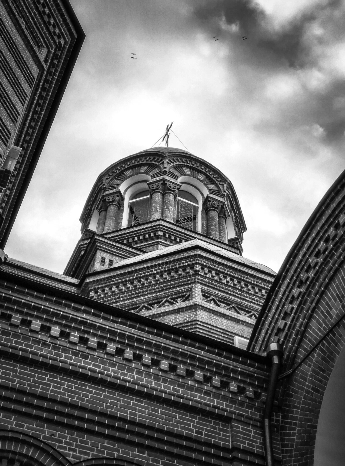 Черно-белое исполнение снимка придает изображению вневременной характер, акцентируя внимание на архитектурных формах и духовной символике. Темное облачное небо на фоне создает драматический контраст, выделяя светлые поверхности храма и emphasizing его сакральное значение в городском пространстве.