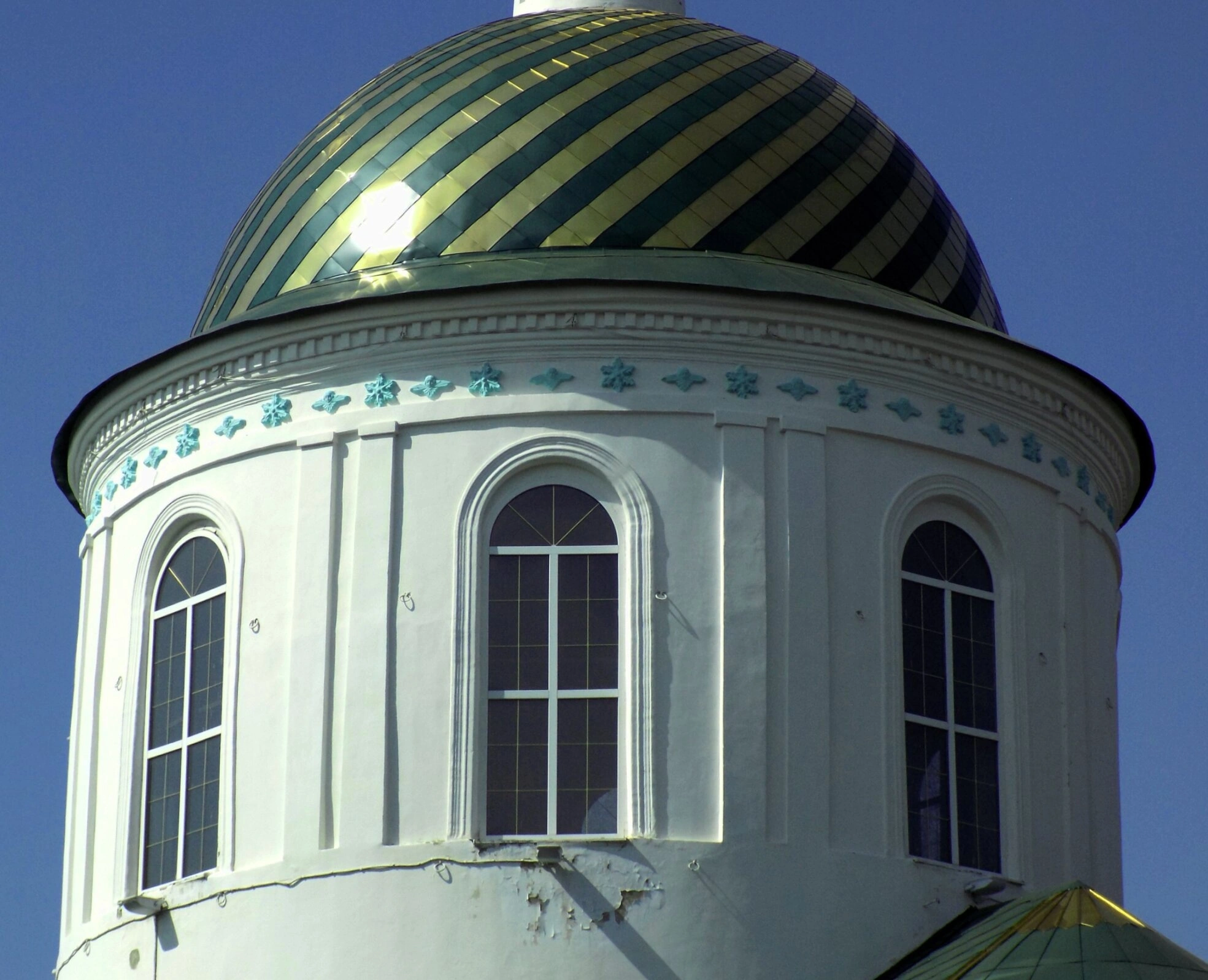 На представленной фотографии запечатлён величественный купол Свято-Троицкого храма, расположенного в городе Суджа Курской области. Центральным элементом снимка является характерная для русского церковного зодчества луковичная глава, увенчанная православным крестом, который устремлён в небеса. Купол обладает выразительным полосатым покрытием, где чередуются золочёные и тёмно-зелёные ярусы, что создаёт игру света и подчёркивает сакральную красоту сооружения.