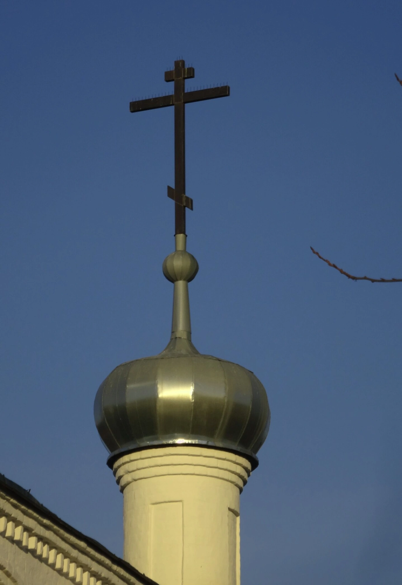 На фотографии запечатлён величественный главный купол Свято-Троицкой церкви, расположенной в селе Каменово Владимирской области. Золочёный православный крест, венчающий купол, устремлён в небеса, символизируя победу жизни над смертью и напоминая о крестных страданиях Спасителя. Купол выполнен в традиционном для русского храмового зодчества стиле и имеет характерную луковичную форму, которая традиционно символизирует пламя свечи.