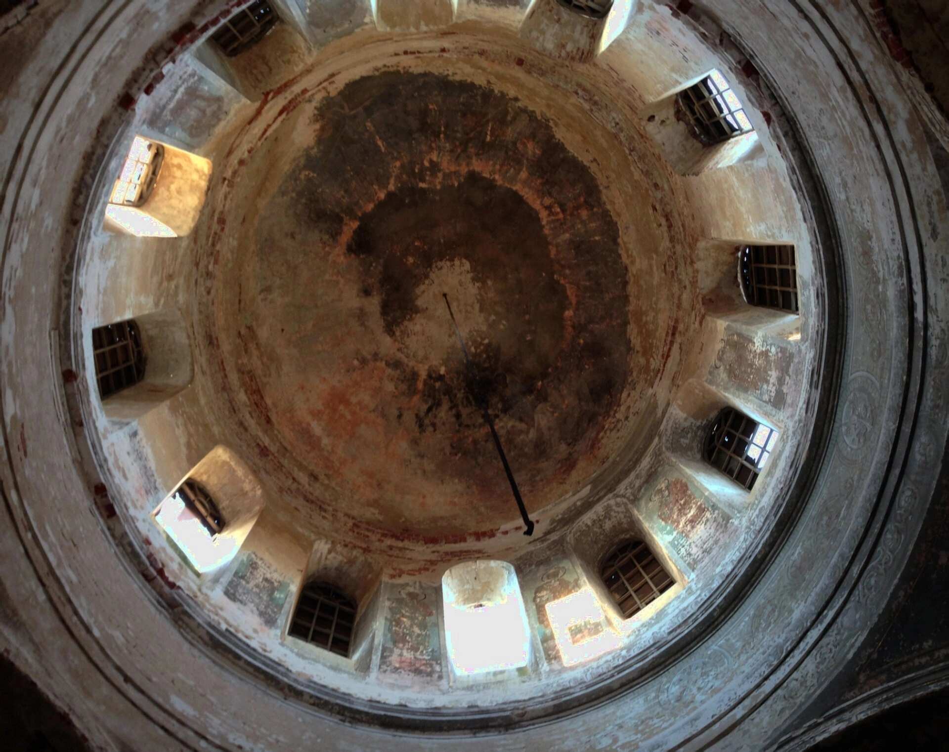 В центральной части купола чётко виден кованый элемент — центральное кольцо для подвешивания паникадила, главной церковной люстры, освещающей пространство во время вечерних богослужений и праздников. На фотографии просматриваются фрагменты уникальной настенной росписи, украшавшей внутреннюю поверхность свода. К сожалению, время и запустение наложили свой отпечаток: видны следы разрушения штукатурного слоя и утраты отдельных фрагментов фресок.
