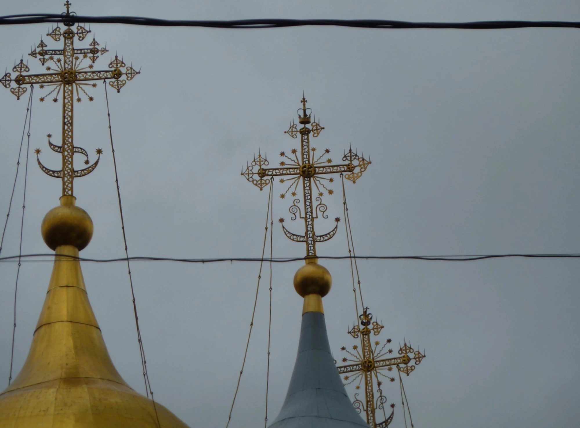 От крестов к поверхности куполов спускаются тонкие металлические тросы-растяжки, обеспечивающие устойчивость конструкций при ветровых нагрузках. На заднем плане фотографии видно пасмурное небо столицы и линии электропередач, что создаёт контраст между земным и небесным.