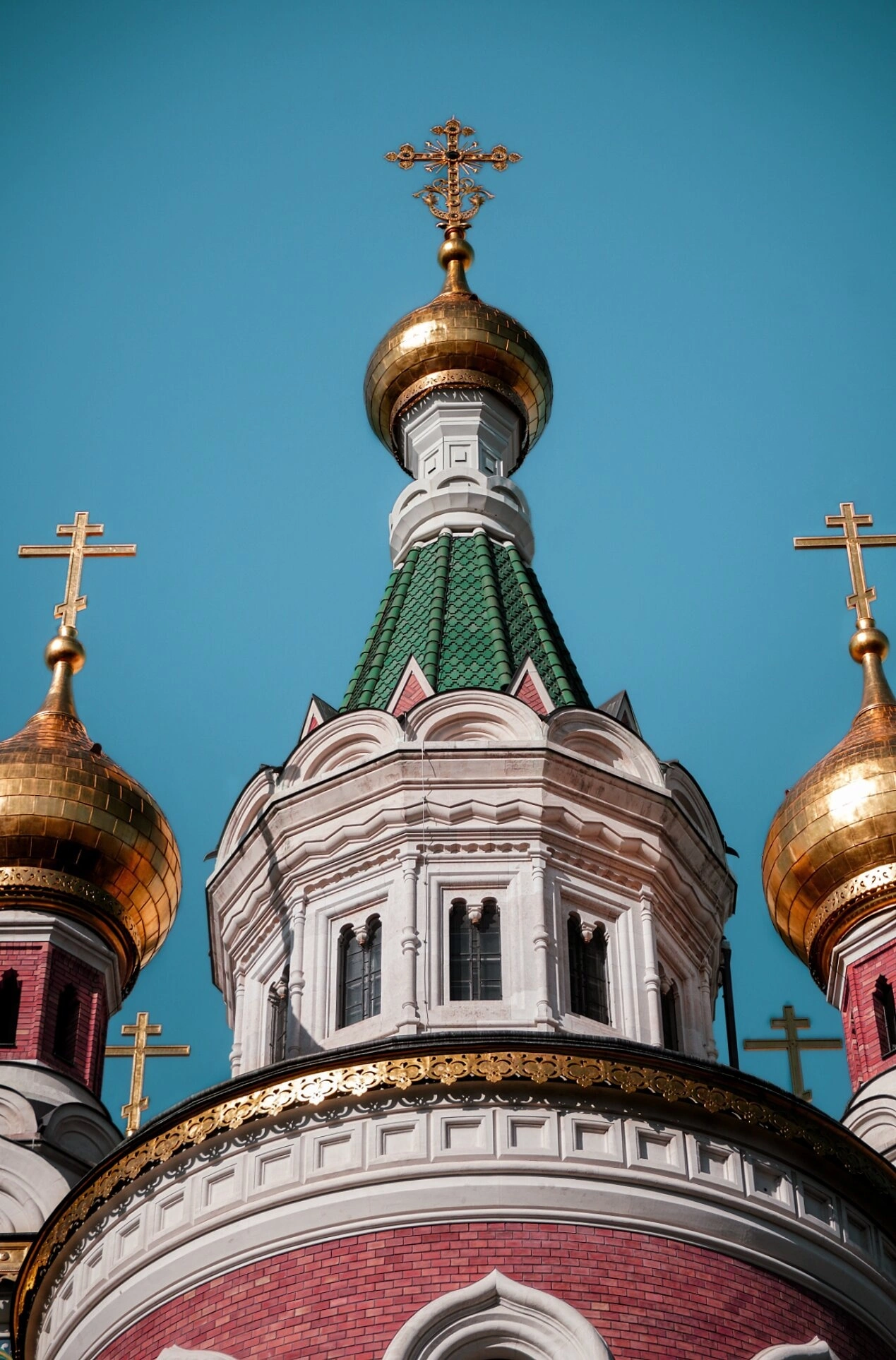 Под центральным куполом чётко просматривается высокий восьмигранный барабан, прорезанный арочными оконными проёмами, которые украшены изящными рельефными элементами. Декоративные вставки из зелёной керамической черепицы добавляют яркий цветовой акцент и подчёркивают изобилие русского узорочья. Ниже видны фрагменты фасада, где сочное сочетание красного кирпича и белого декоративного камня создаёт неповторимый и узнаваемый облик, наполненный глубоким символизмом.