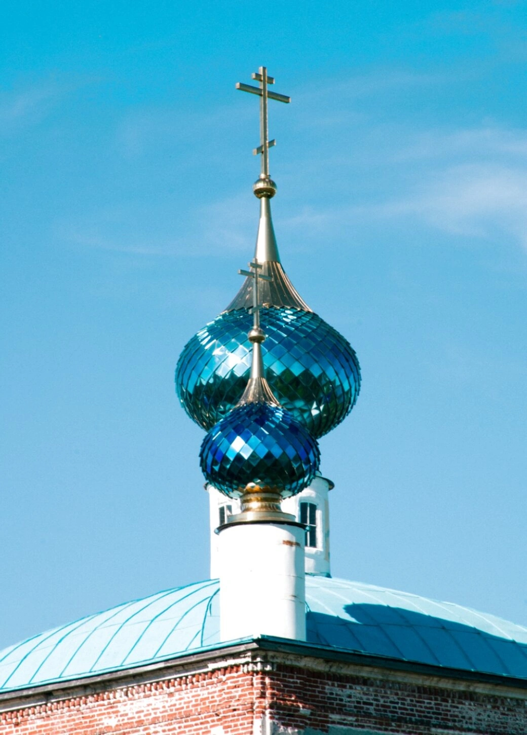 Крупным планом изображены два синих купола луковичной формы, характерных для традиционного русского церковного зодчества. Купола покрыты чешуйчатой плиткой, создающей благородную фактуру поверхности и играющей светотенью в солнечных лучах. Каждый купол венчает золоченый православный крест, символизирующий искупительную жертву Христа и надежду на воскресение.