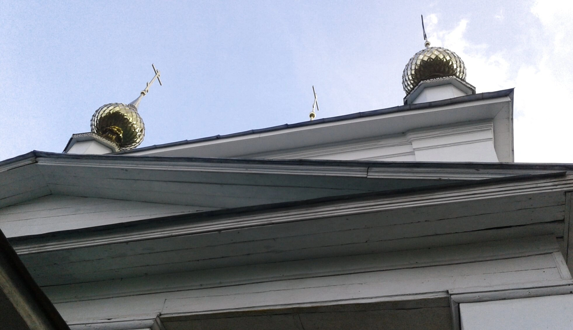 На представленной фотографии запечатлены величественные золочёные купола Спасо-Преображенского храма, что расположен в историческом центре города Шуи Ивановской области. Два главных купола, увенчанные православными крестами, ярко сияют под лучами солнца на фоне ясного голубого неба с легкими облаками.