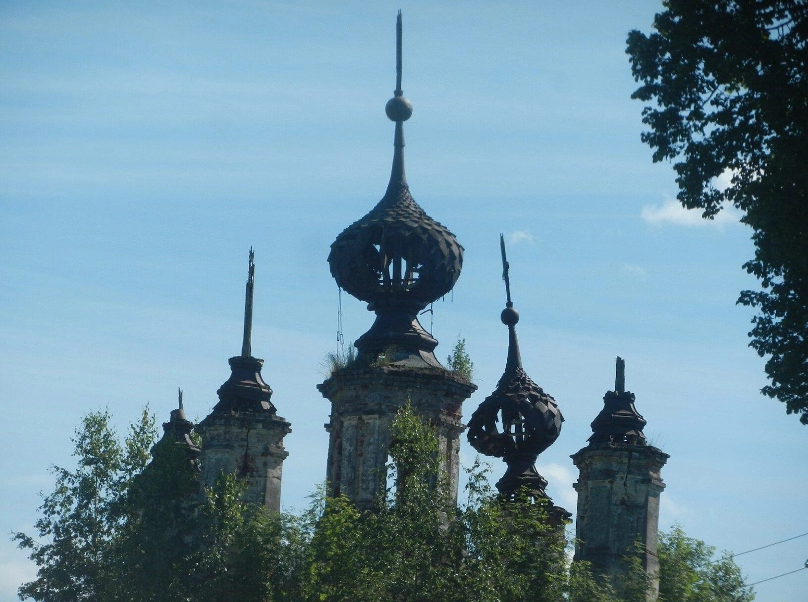 На представленной фотографии запечатлена верхняя часть Троицкой церкви, расположенной в селе Михальково. Храм, находящийся в полуразрушенном состоянии, сохранил свои архитектурные особенности и духовное величие despite времени и запустения.