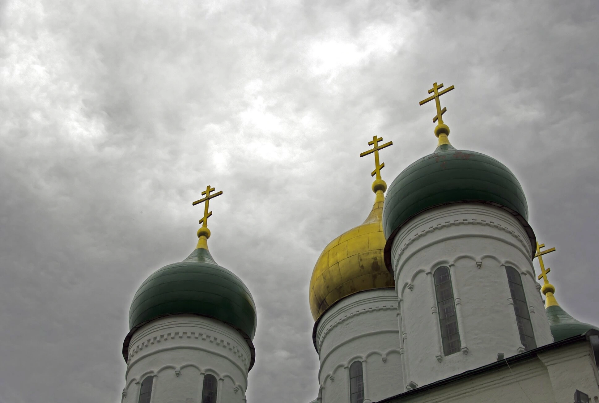 На представленной фотографии запечатлены величественные купола Успенского кафедрального собора, расположенного в историческом центре Коломны. Снимок демонстрирует три из пяти глав храма, возносящихся к небесам. Две главы имеют насыщенный зелёный цвет, символизирующий жизнь вечную, а центральная увенчана золотистым покрытием, напоминающим о нетленной славе Божией. Все купола выполнены в традиционной русской луковичной форме, характерной для православного церковного зодчества.