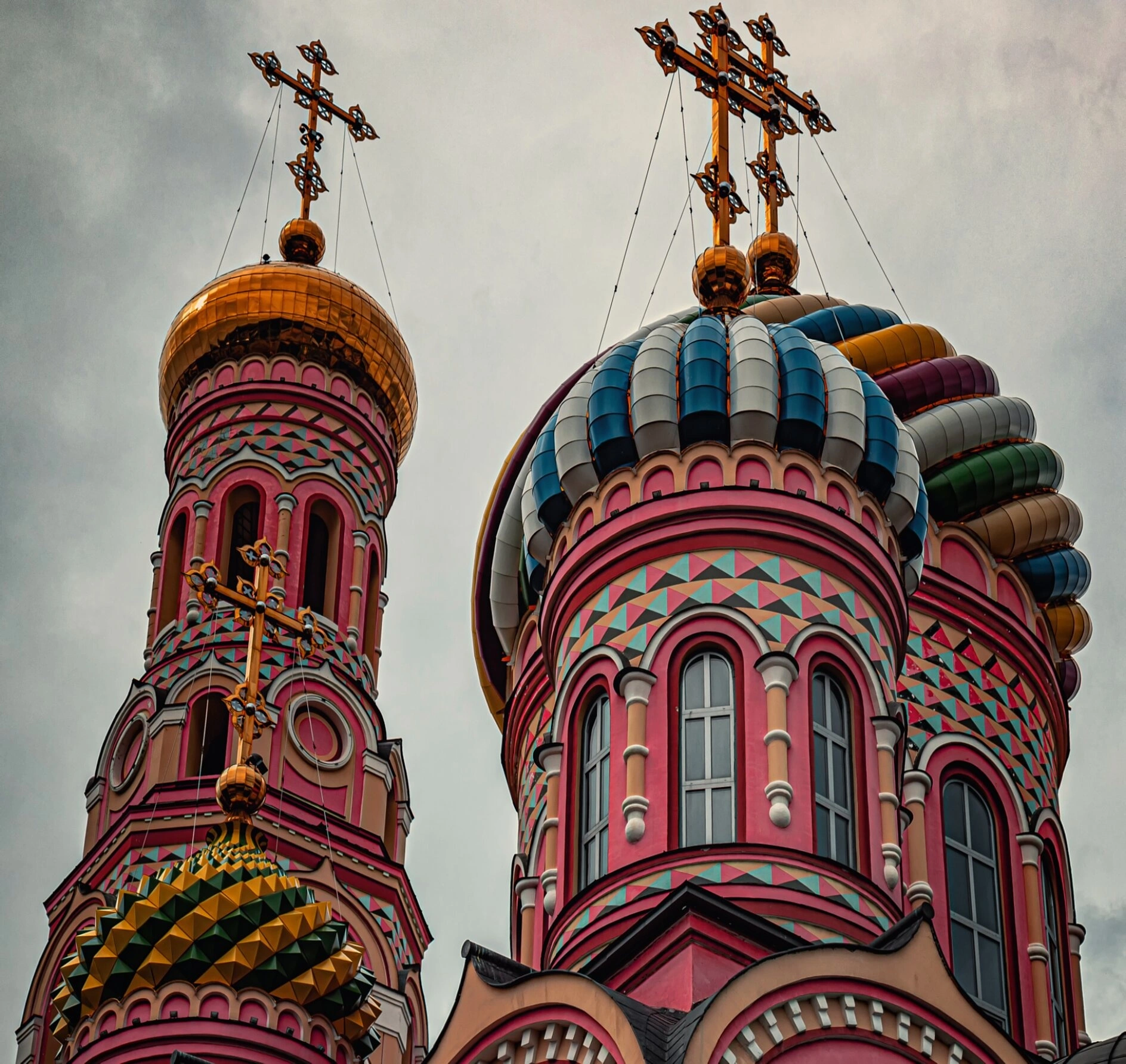 Центральным элементом композиции выступает мощный позолоченный купол, символизирующий Христа как главу Церкви. Его сияние, видимое издалека, служит духовным ориентиром для верующих. Вокруг главного купола располагаются изящные малые главы, обильно украшенные ярким полихромным орнаментом. Сочетание голубых, белых, розовых и золочёных красок создаёт праздничное и нарядное восприятие, характерное для традиций русского узорочья.
