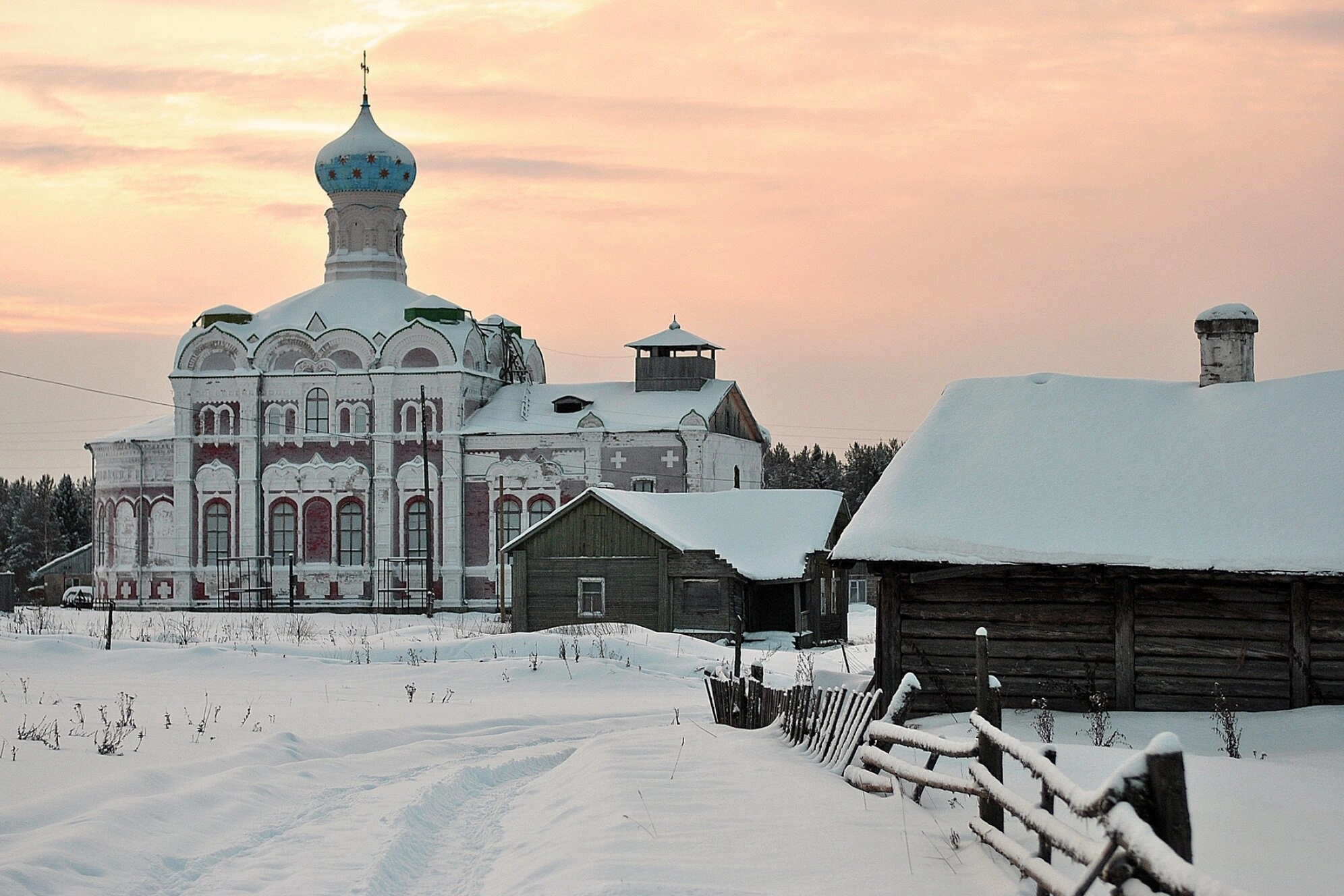 На представленной фотографии запечатлён Кылтовский Крестовоздвиженский женский монастырь, расположенный в Республике Коми, в суровый зимний период. Снежный покров окутывает святую обитель, создавая атмосферу благоговейной тишины и умиротворения, свойственной иноческой жизни.
