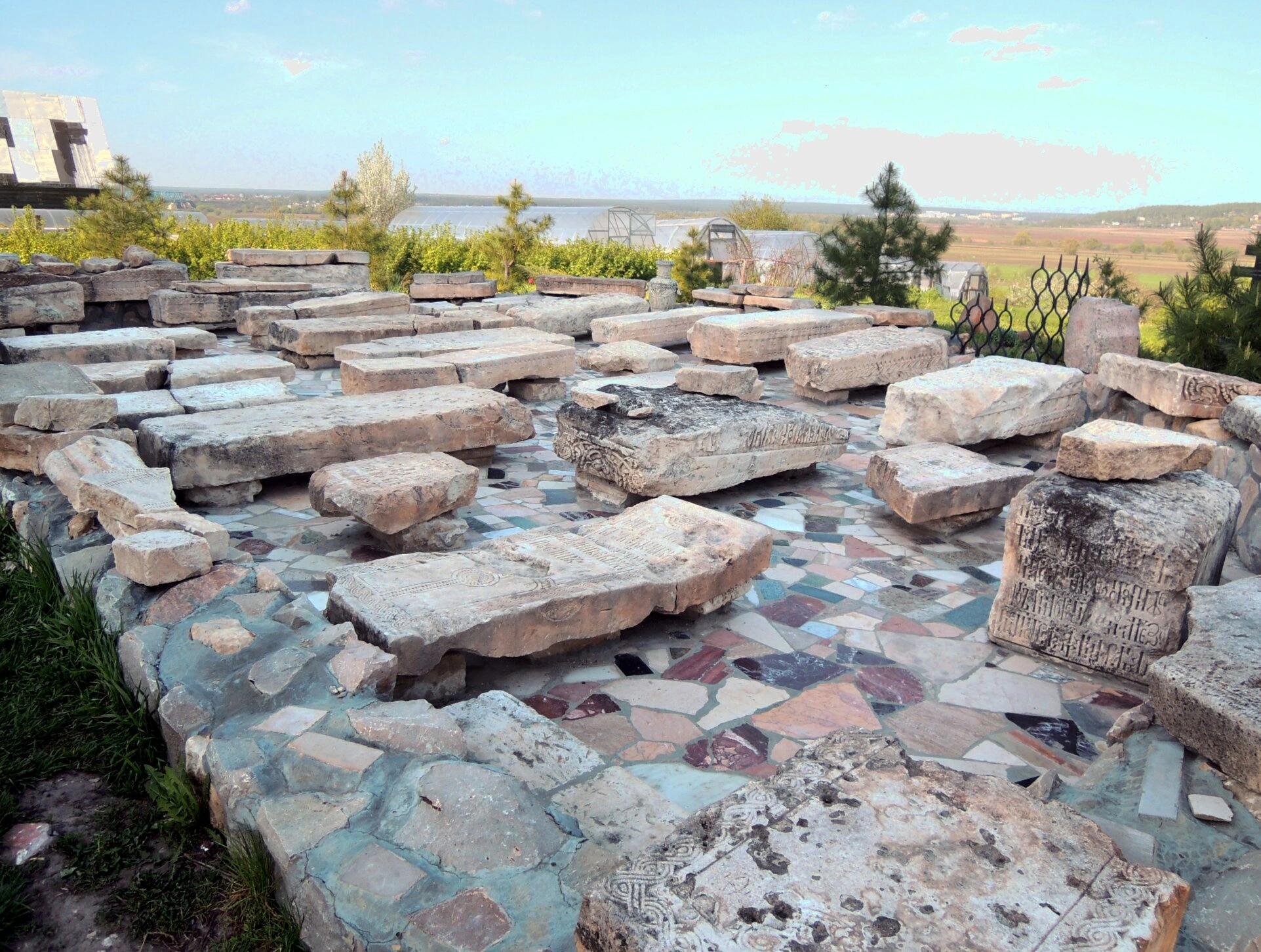 Коллекция каменных надгробий представляет особую историко-культурную ценность. На фотографии видны плиты различных форм и размеров, относящиеся к XVI-XIX векам. Многие из них сохранили фрагменты древних надписей и православной символики — крестов, растительных орнаментов и эпитафий, выполненных старославянской вязью.