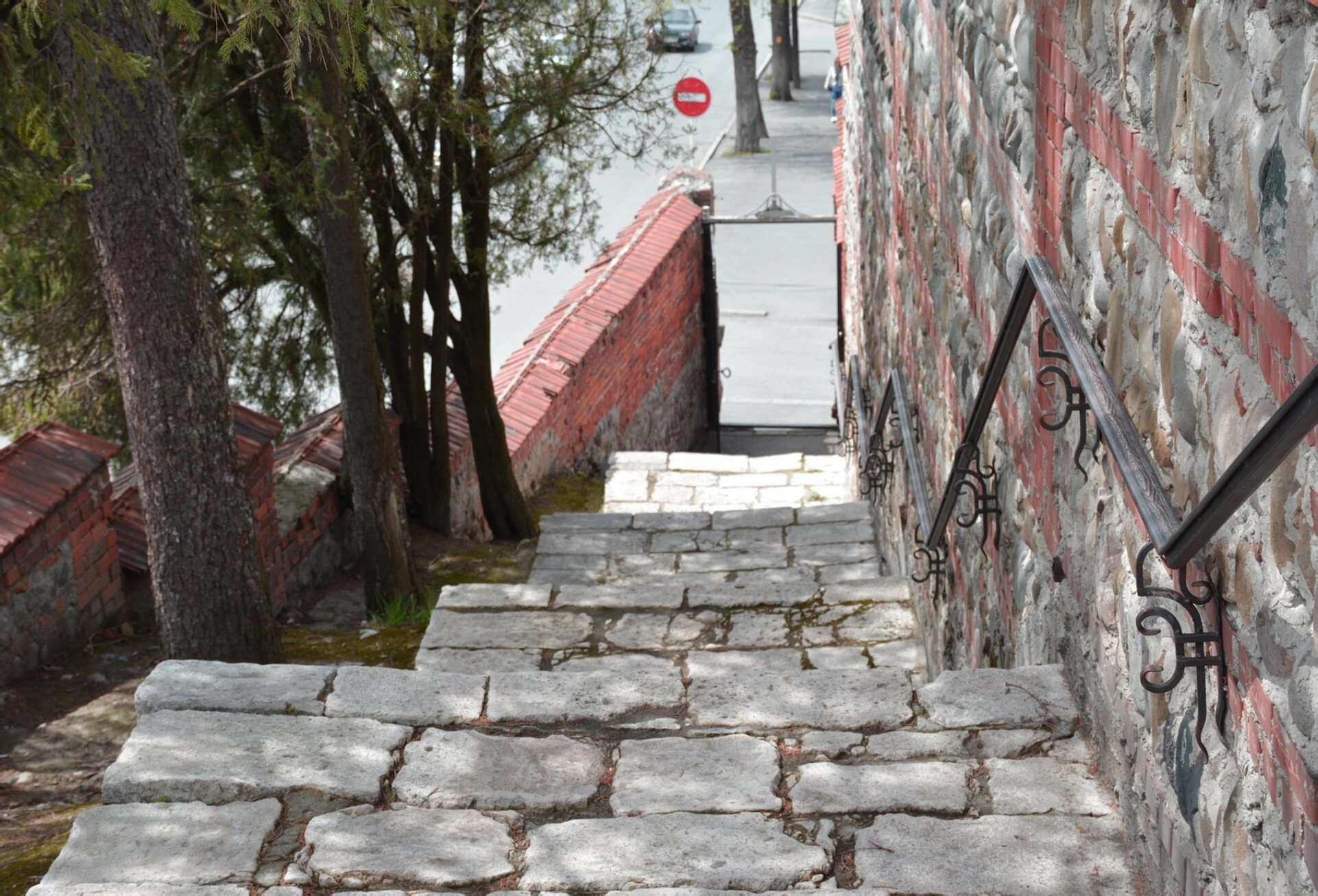 На представленной фотографии запечатлена монументальная каменная лестница, ведущая к одной из главных православных святынь Владикавказа — Осетинской церкви, освящённой в честь Рождества Пресвятой Богородицы. Ступени, выложенные из прочного камня и обрамлённые коваными металлическими перилами, символически соединяют мирскую суету города с тишиной и благодатью домом Божиим. Лестница спускается вдоль массивной стены, сложенной из камня и кирпича, что придаёт всему архитектурному комплексу ощущение надёжности и вечности.