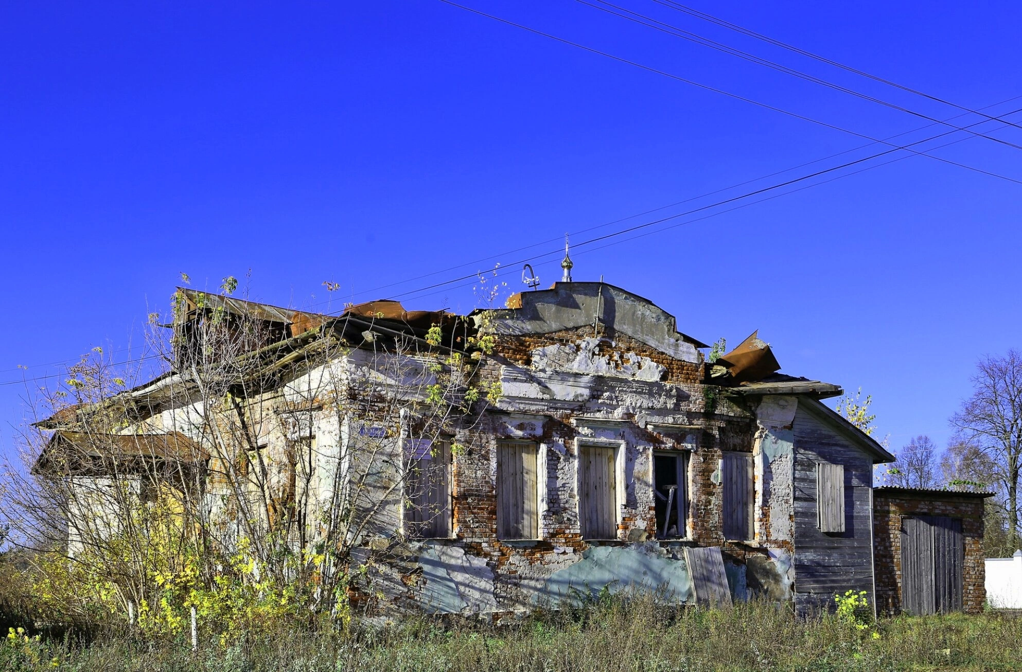На представленной фотографии запечатлена летняя церковь Введения во храм Пресвятой Богородицы, расположенная в селе Костино Шуйского района Ивановской области. Храм находится в полуразрушенном состоянии, но даже в руинах сохраняет величие православной святыни.