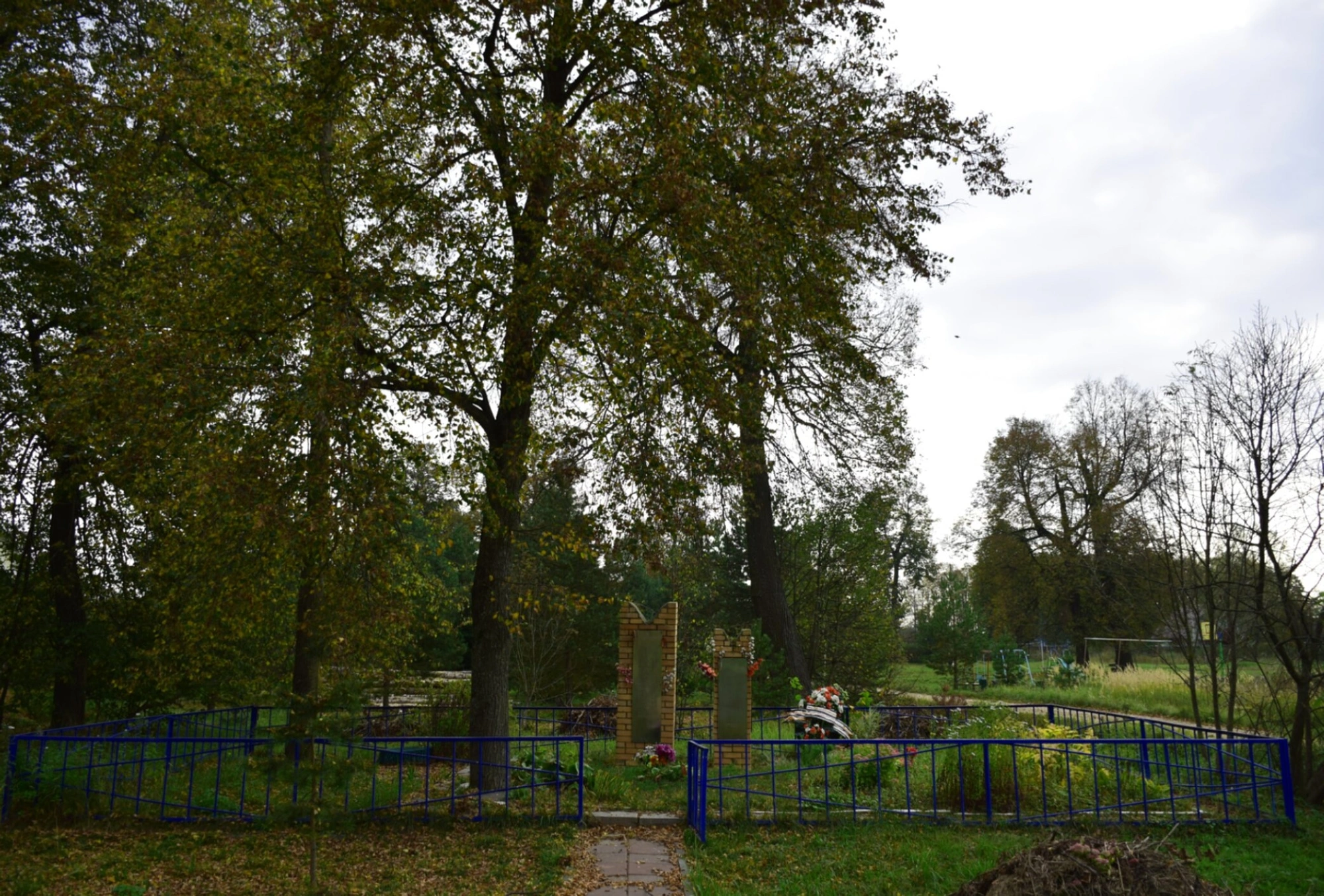 Окружающий ландшафт характеризуется живописным осенним пейзажем: по обеим сторонам от захоронения возвышаются взрослые деревья с золотистой листвой, создающие атмосферу умиротворенности и вечной памяти. Пасмурная погода с облачным небом добавляет снимку особую эмоциональную глубину и торжественность, соответствующие месту упокоения воинов.