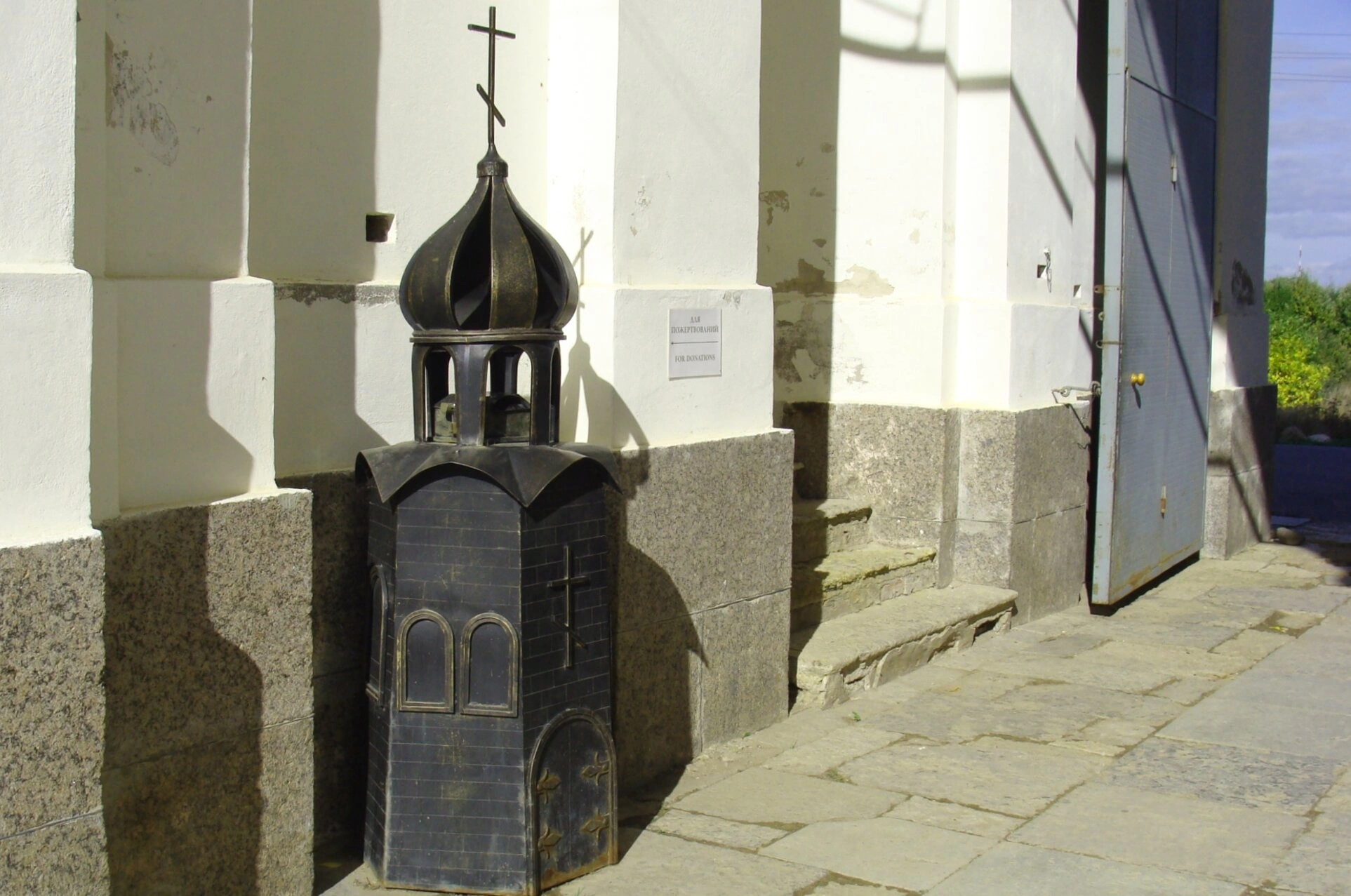 Макет расположен на аккуратно вымощенной каменной плитке перед светлым фасадом одного из монастырских зданий. На заднем плане чётко видны мощные стены монастырского строения, вероятно, братского корпуса, с тёмным каменным цоколем и арочным дверным проёмом, ведущим во внутренние помещения. Справа от композиции просматривается зелёная растительность, дополняющая спокойный и умиротворённый вид святого места.