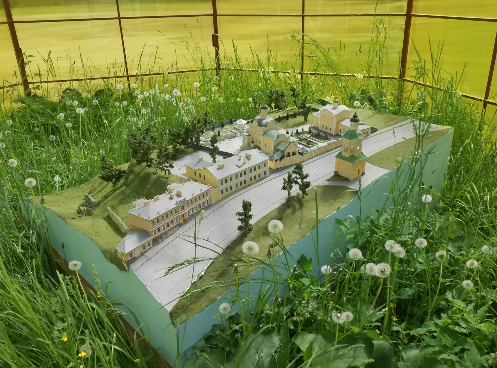 Макет установлен под открытым небом, что позволяет оценить его масштаб и гармоничное расположение зданий на местности. Зелёная трава и цветущие одуванчики вокруг модели создают естественное обрамление, символизируя связь духовной твердыни с божьим творением. Размытый фон с золотистым оттенком придаёт изображению характер возвышенности и отрешённости от мирской суеты, словно созерцание святого места через призму времени.