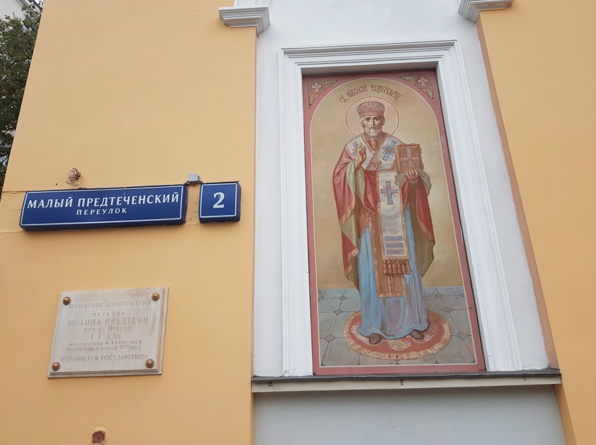 На представленной фотографии запечатлён фрагмент исторической застройки Малого Предтеченского переулка в Москве, непосредственно связанный со знаменитым храмом Рождества честного славного Пророка, Предтечи и Крестителя Господня Иоанна на Пресне. Центральное место на снимке занимает благоговейно размещённая на фасаде здания икона святого Иоанна Предтечи, небесного покровителя этой местности и самого переулка. Святой образ, традиционно почитаемый в православии, осеняет собой это место и напоминает каждому прохожему о вечных ценностях.
