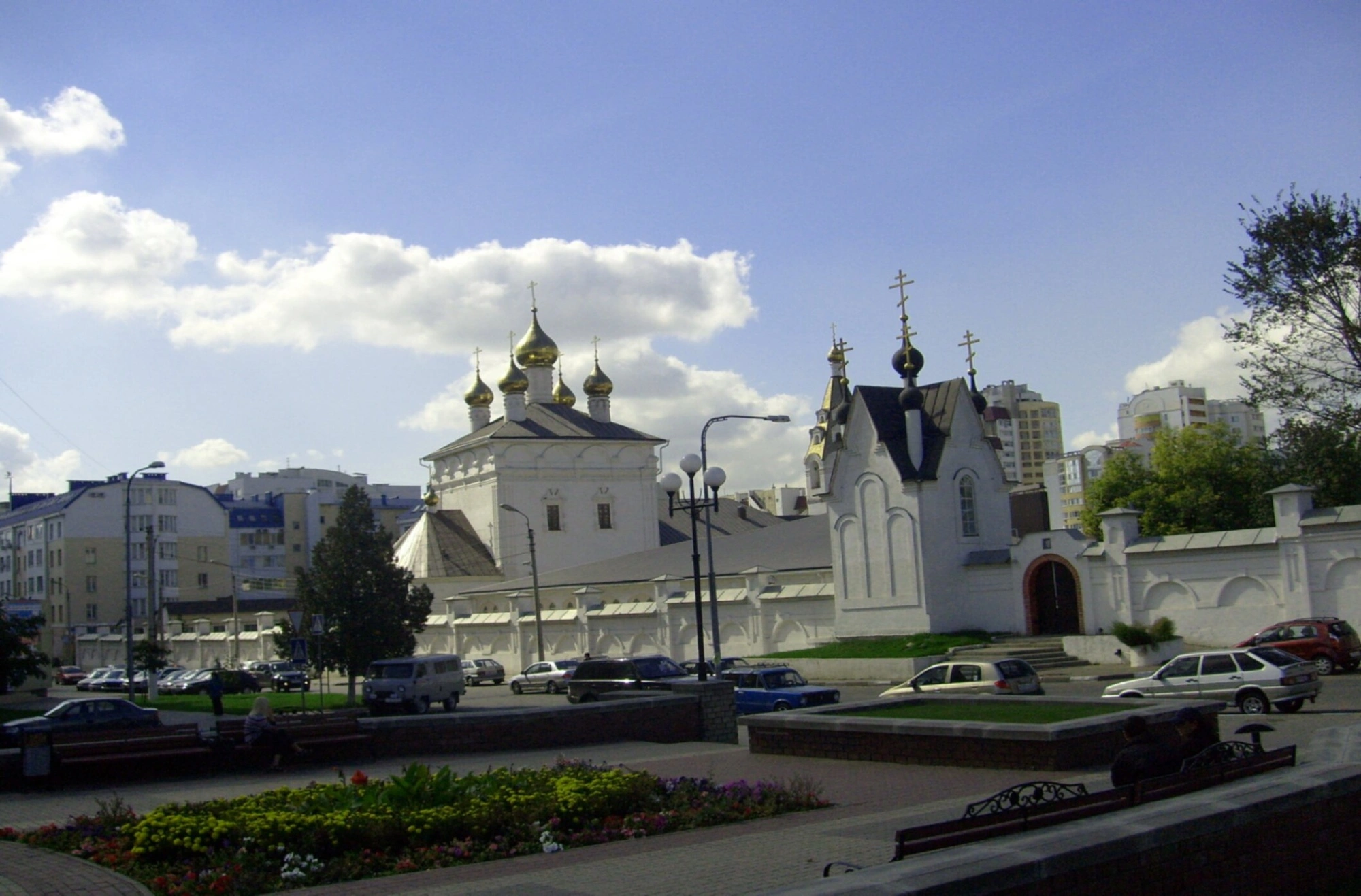 На переднем плане фотографии видна благоустроенная территория монастыря с ухоженными клумбами и скамейками для паломников. За монастырской оградой просматриваются городские жилые дома, что символизирует соединение монашеской жизни с миром. На снимке отсутствуют люди, что позволяет в полной мере appreciate архитектурный ансамбль и уединённую атмосферу святого места.