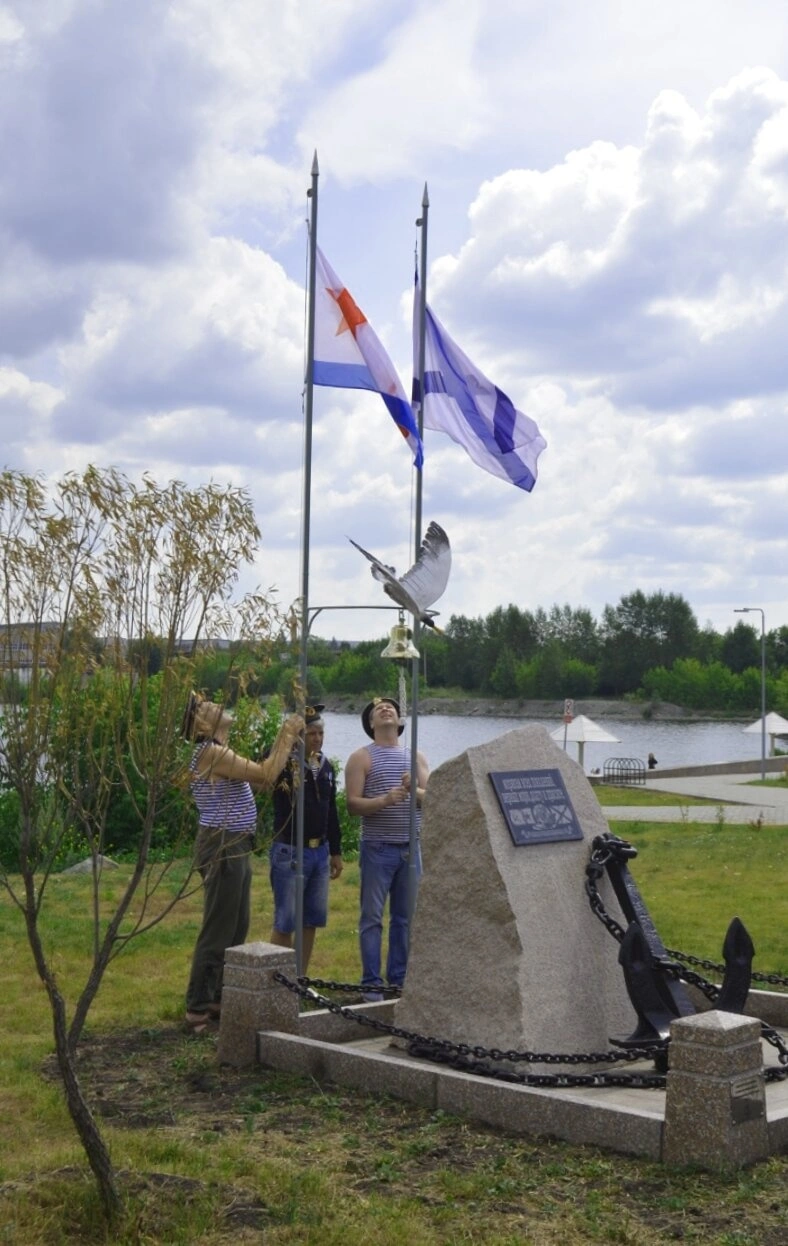 Мемориал расположен на живописном берегу водоема, что создает особую духовную атмосферу места. На заднем плане просматриваются стройные деревья и облачное небо, добавляющие величия всей композиции. Присутствие трех человек в морской форме, участвующих в церемонии, подчеркивает значимость момента и продолжение славных традиций российского флота.