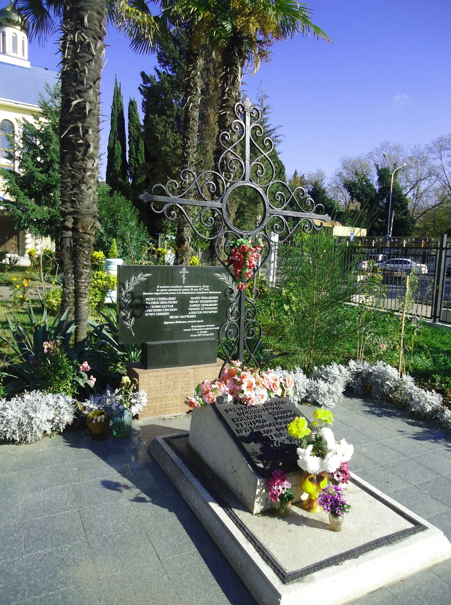 На представленной фотографии запечатлён мемориальный комплекс, расположенный в пределах территории храма Святого Духа, что в Адлерском районе города Сочи. Свято-Духовский храм, возведённый в традициях русского церковного зодчества, является духовным центром для православных верующих этого приморского региона.