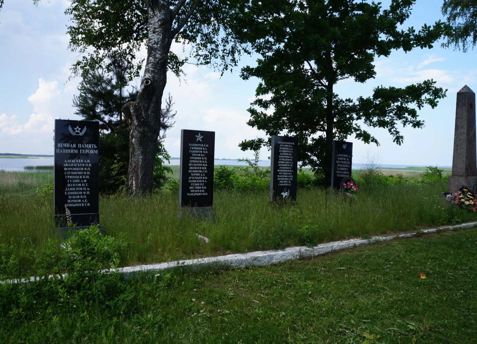 На фотографии запечатлен мемориальный комплекс «Вечная память павшим героям», расположенный на живописном берегу Псковского озера в Гдовском районе. Данный мемориал представляет собой братские могилы защитников Отечества, входящие в состав мемориального комплекса «Ледовое побоище».