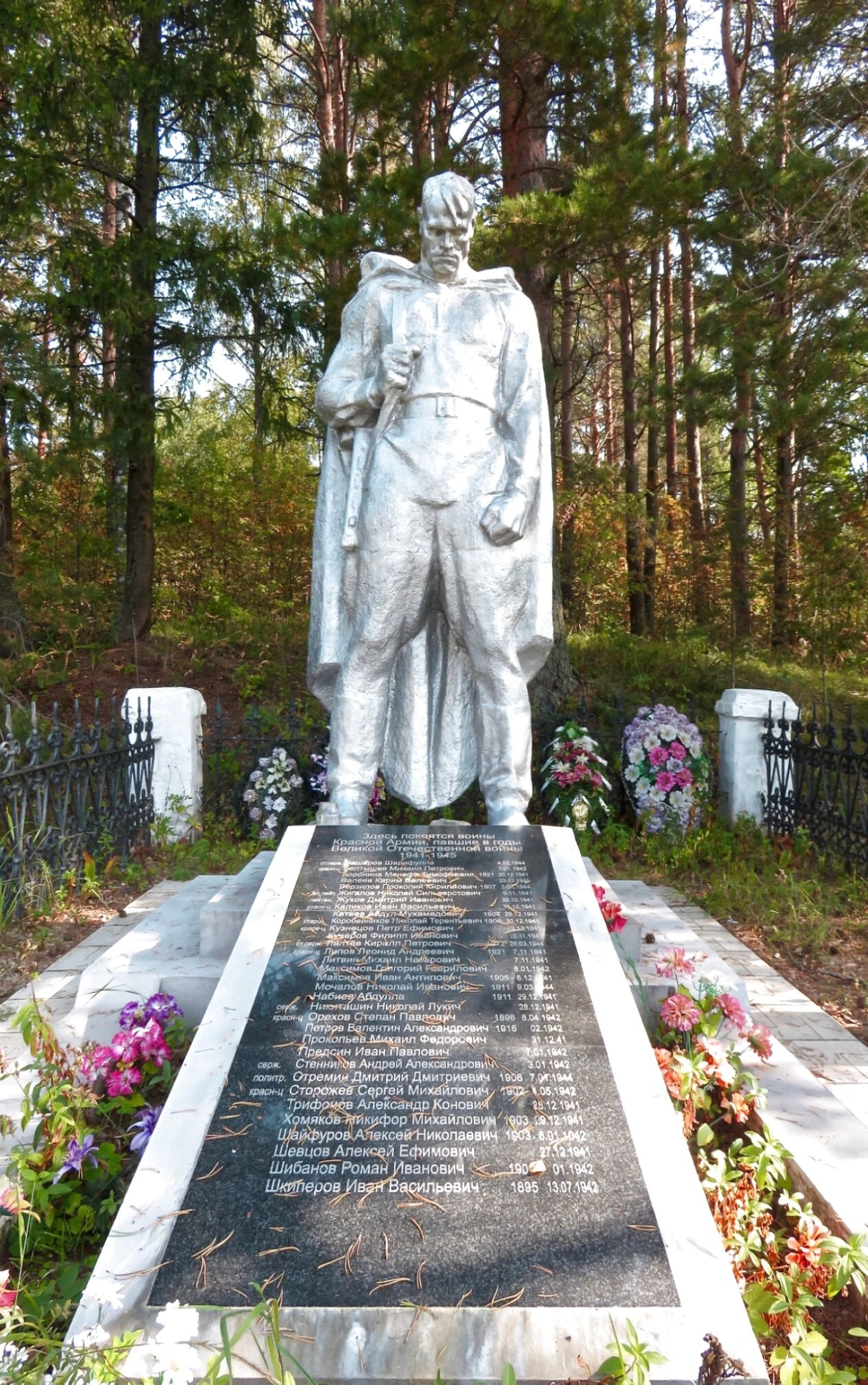 В центре мемориальной композиции возвышается монументальная скульптура советского воина в полный рост. Солдат облачен в военную форму с плащ-палаткой, в его руках замер автомат – символ готовности к защите родной земли. Выразительный образ воина передает мужество и стойкость защитников Отечества, их вечную готовность к подвигу.