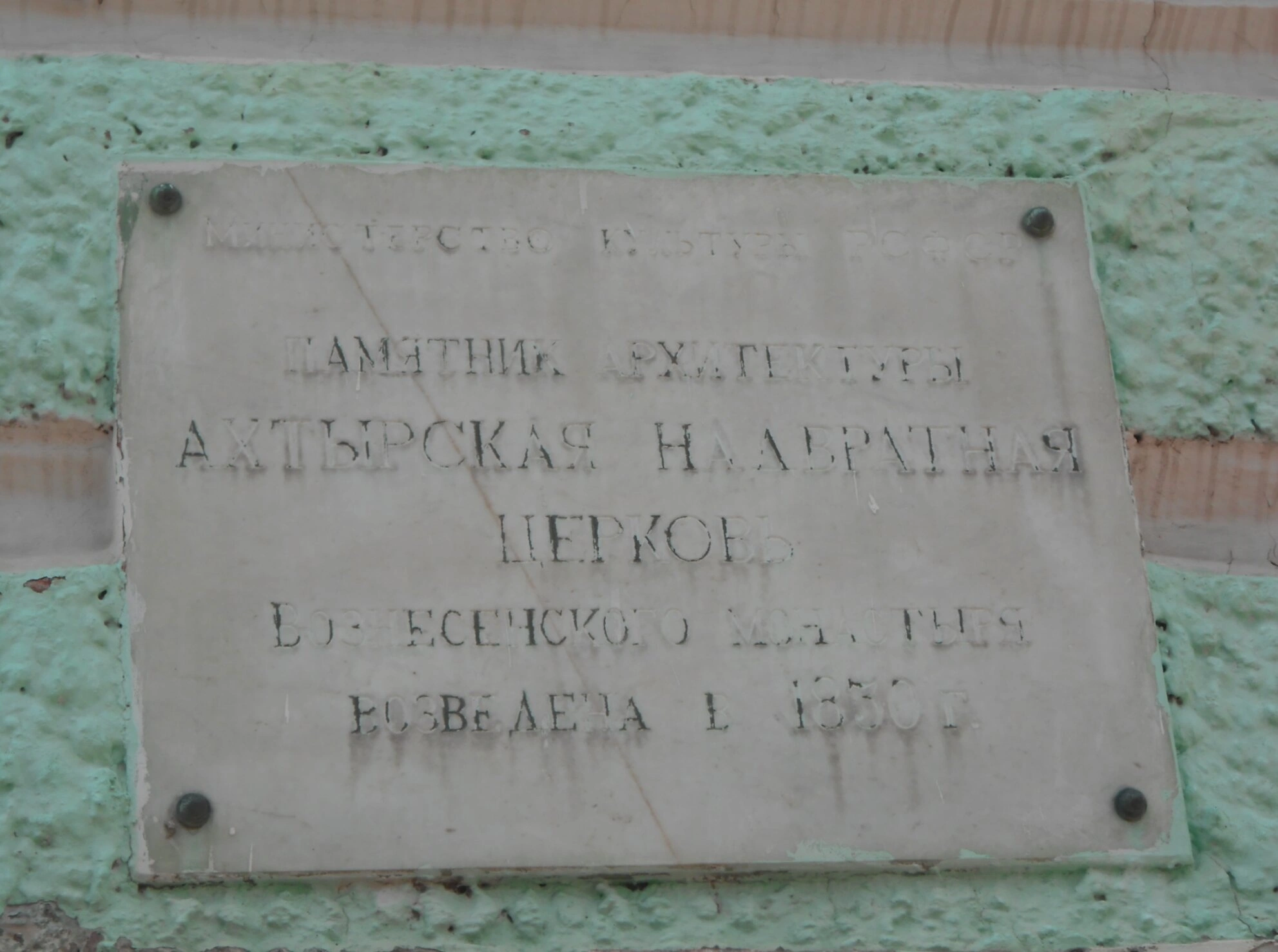 На фотографии запечатлена мемориальная доска, установленная на стене здания. Изделие выполнено из светлого камня, на поверхности которого выгравирована памятная надпись на русском языке. Несмотря на то что время частично стерло текст, сохранившиеся фрагменты позволяют узнать об историческом памятнике. Мемориальная доска свидетельствует о том, что перед нами Акитырская Надвратная церковь, которая была возведена в 1830 году. Подобные памятные знаки традиционно устанавливаются для увековечивания информации о значимых объектах православной культуры и являются важной частью исторического наследия. Мемориальная доска выполнена в строгом стиле, что соответствует канонам оформления памятных объектов на территории православных монастырей.