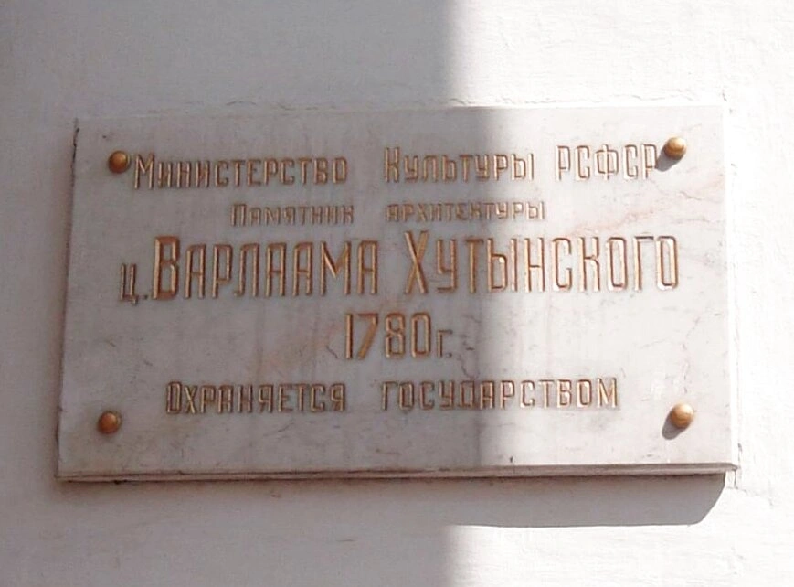 Текст на мемориальной доске свидетельствует: «МИНИСТЕРСТВО КУЛЬТУРЫ РСФСР», «Памятник АРХИТЕКТУРЫ», «Ц. ВАРЛААМА ХУТЫНСКОГО», «1780г.», «ОХРАНЯЕТСЯ ГОСУДАРСТВОМ». Эта таблица официально подтверждает статус храма как объекта культурного наследия федерального значения, находящегося под государственной охраной.