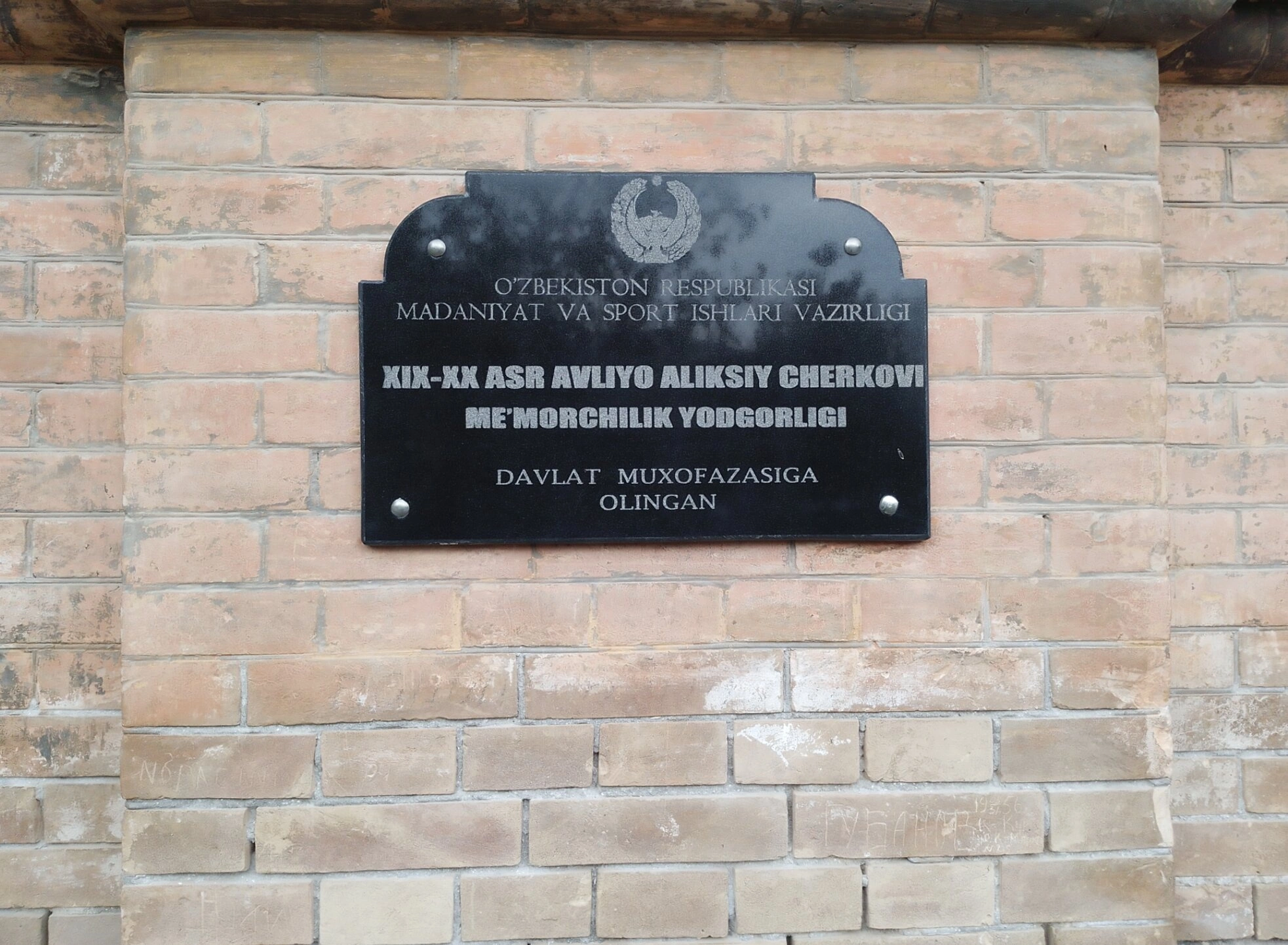 В верхней части доски размещён герб Республики Узбекистан, символизирующий государственную защиту культурного наследия. Ниже указано наименование учреждения, ответственного за сохранность памятника: «O'ZBEKISTON RESPUBLIKASI MADANIYAT VA SPORT ISHLARI VAZIRLIGI» (Министерство культуры и спорта Республики Узбекистан). Центральная часть текста содержит название памятника: «XIX-XX ASR AVLIYO ALIKSIY CHERKOVI ME'MORCHILIK YODGORLIGI» (Архитектурный памятник Церковь Святого Алексия XIX-XX веков). В нижней части указан статус объекта: «DAVLAT MUXOFAZASIGA OLINGAN» (Находится под государственной охраной).