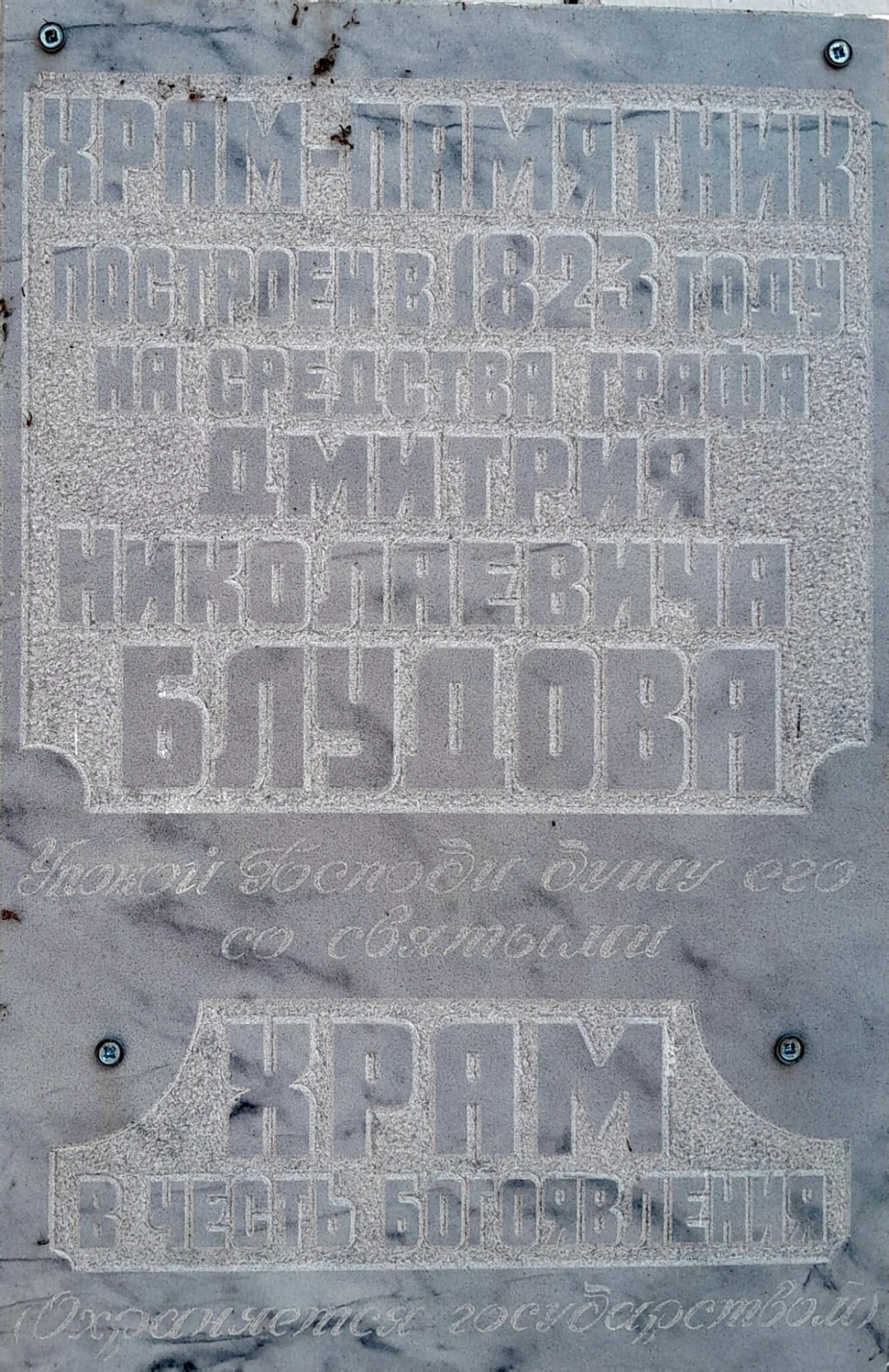 Надпись на плите гласит: «ХРАМ-ПАМЯТНИК ПОСТРОЕН В 1823 ГОДУ НА СРЕДСТВА ГРАФА ДМИТРИЯ НИКОЛАЕВИЧА БЛУДОВА». Ниже следует благочестивая эпитафия: «УПОКОЙ ГОСПОДИ ДУШУ ЕГО СО СВЯТЫМИ», являющаяся традиционным православным молением о упокоении души усопшего. В нижней части указано посвящение храма: «ХРАМ В ЧЕСТЬ БОГОЯВЛЕНИЯ», а также отметка о том, что объект охраняется государством.