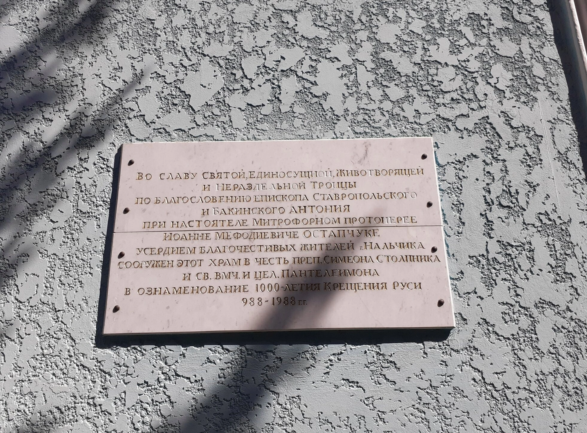 Текст на доске, выполненный на церковнославянском языке, гласит: «Во славу Святыя, Единосущныя, Животворящия и Нераздельныя Троицы по благословению Епископа Ставропольского и Бакинского Антония при настоятеле митрофорном протоиерее Иоанне Мефодиевиче Остапчуке усердием благочестивых жителей Нальчика сооружен этот храм в честь преп. Симеона Столпника и св. вмч. и цел. Пантелеимона в ознаменование 1000-летия Крещения Руси 988–1988 гг.».