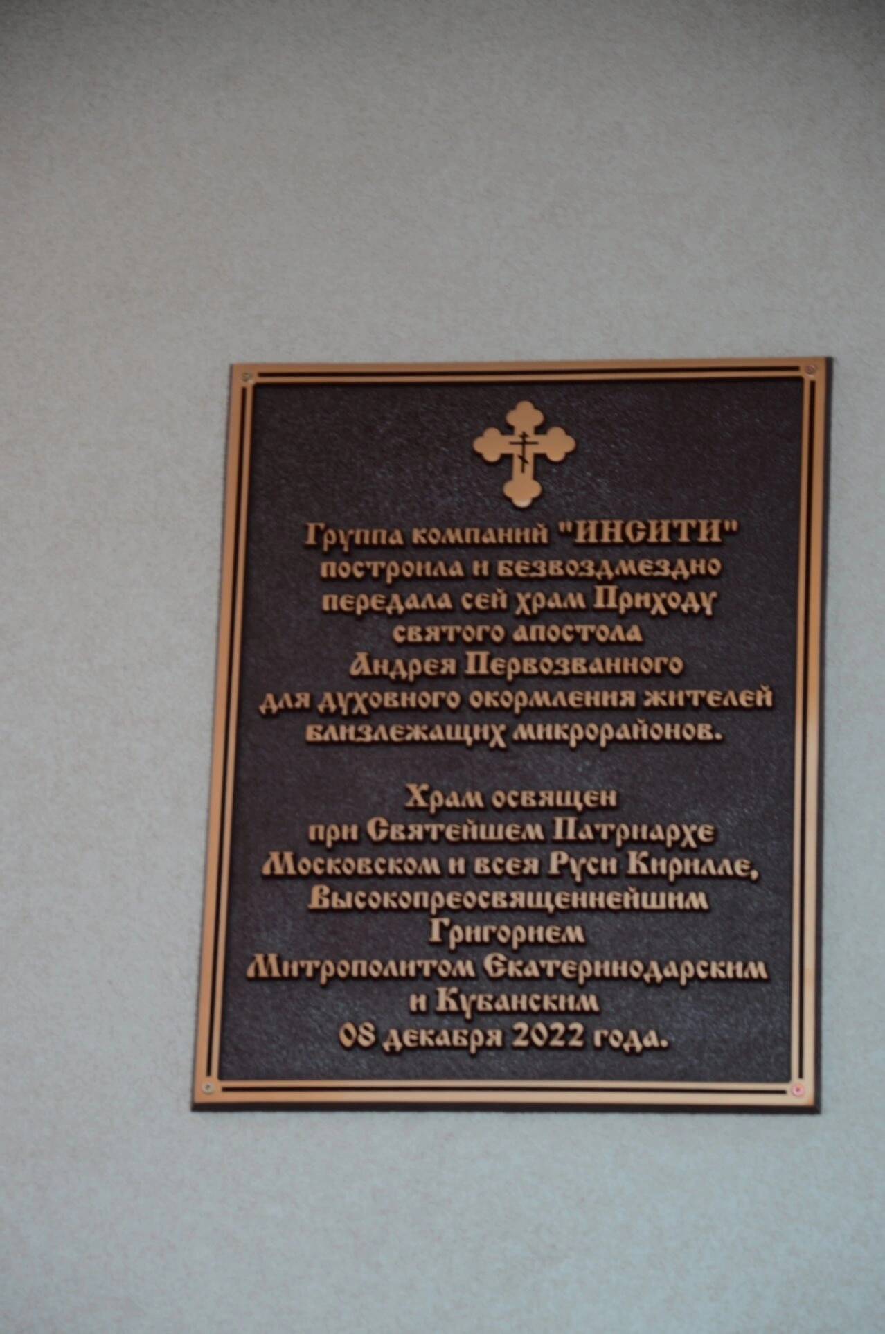 Согласно тексту на доске, храм был возведён группой компаний «ИнСити» и безвозмездно передан церковной общине для духовного окормления жителей близлежащих микрорайонов. Этот благотворительный акт свидетельствует о возрождении традиций храмостроительства на кубанской земле.