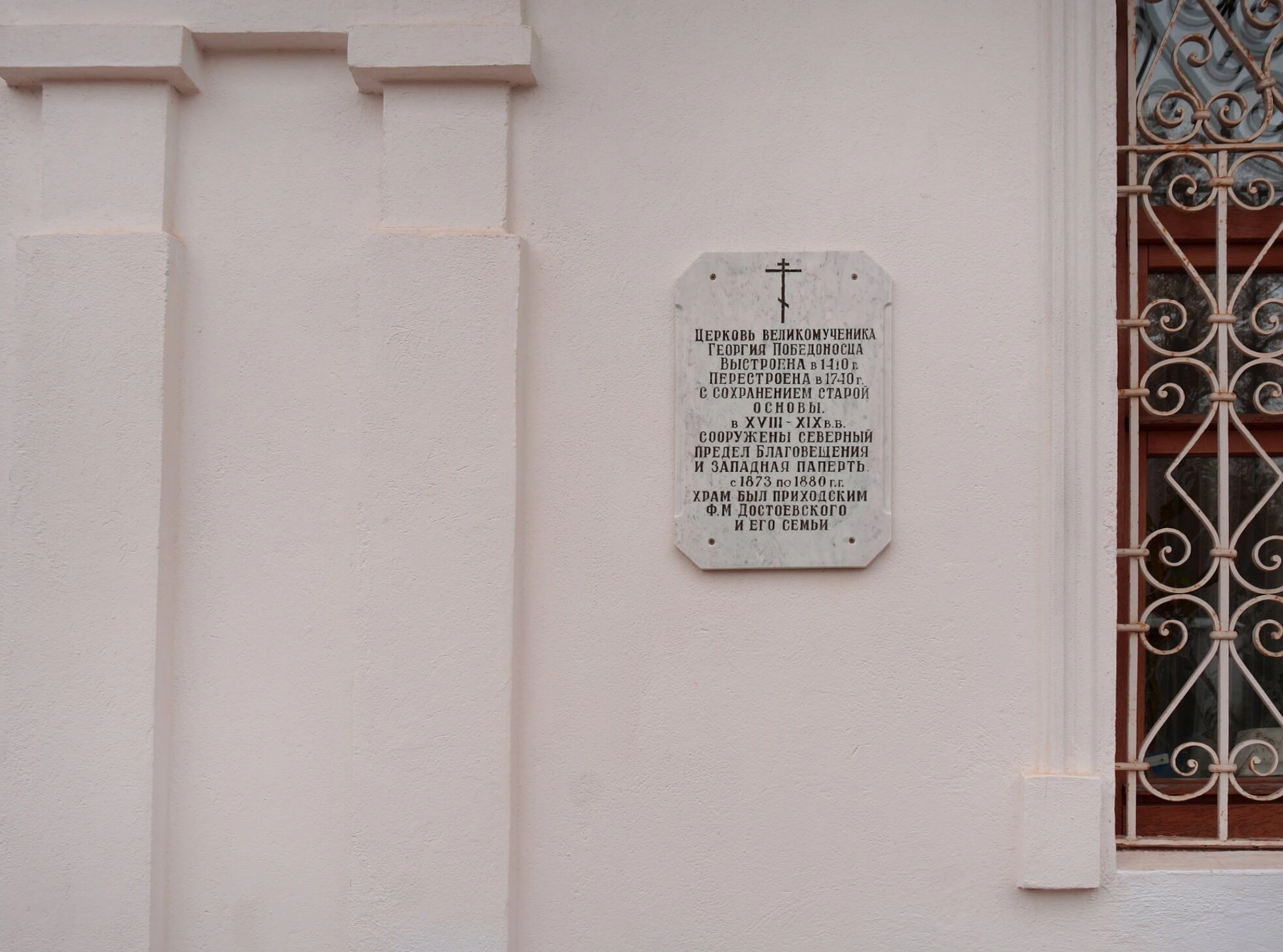 Важнейшим историческим фактом, отмеченным на доске, является то, что Георгиевский храм был приходским для великого русского писателя Фёдора Михайловича Достоевского и его семьи. Это духовное окормление несомненно оказало влияние на творчество и мировоззрение писателя, чья жизнь была тесно связана со Старой Руссой.